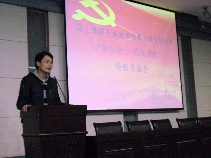 124日下午,国土资源与旅游学院第45届党课培训班全体学员在院实验楼101开展了以“知行合一 创先争优”为主题的学习经验交流会。