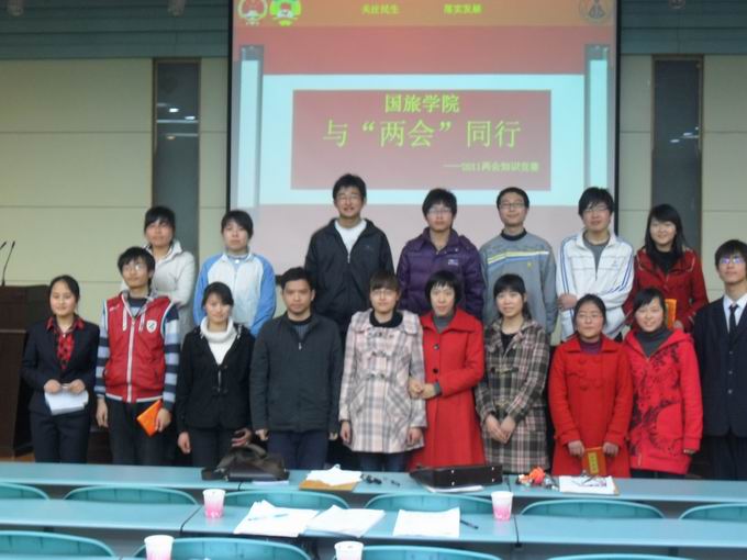 为了深入贯彻“两会”精神,帮助同学们系统学习两会思想,了解党的政策,3月28日晚,国旅学院2009、2010级地理科学专业携手举办了 “与‘两会’同行”知识竞赛活动。比赛邀请了社会学院团委书记杨静老师,09地科辅导员周迎秋老师和10地科辅导员梁超老师担任评委。