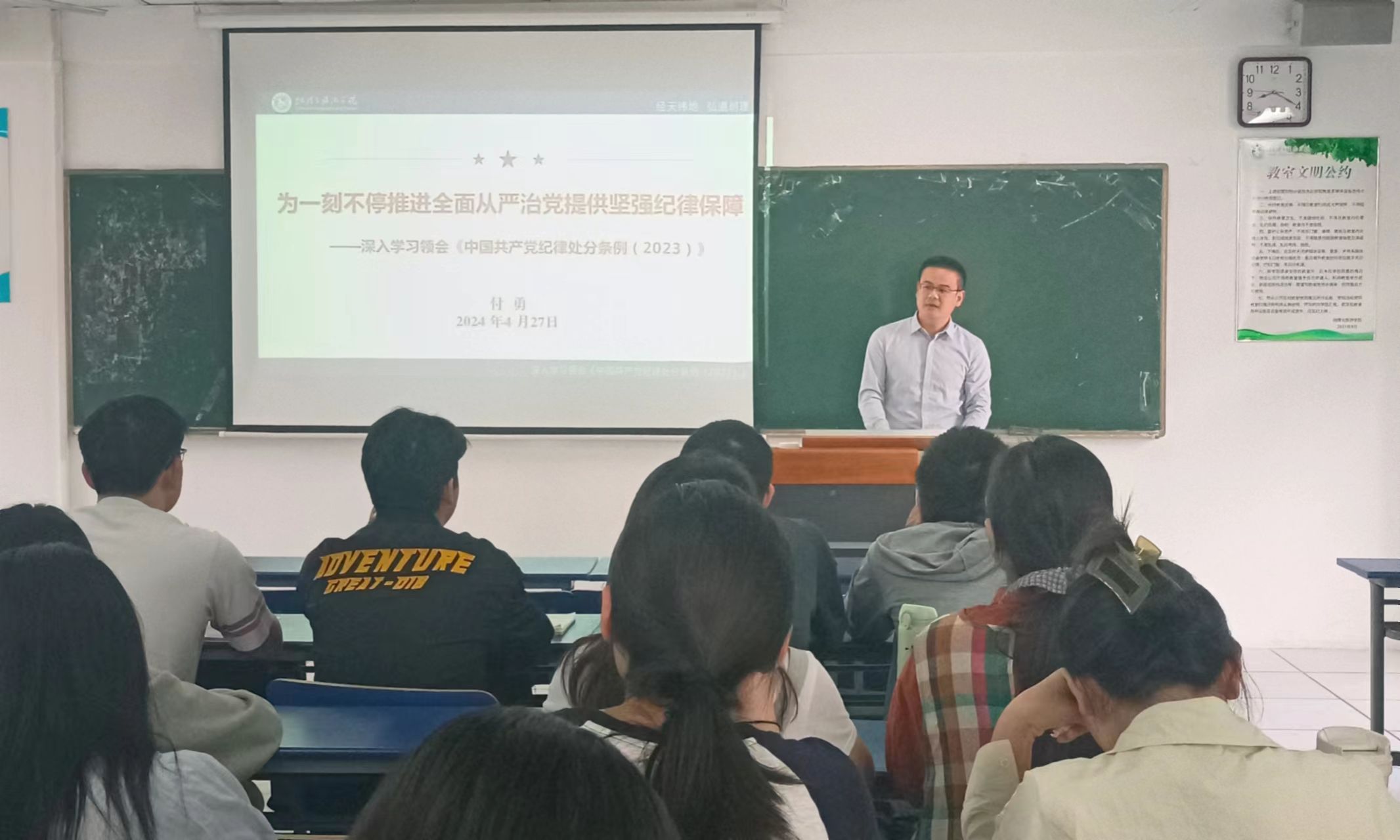 付勇讲授学习贯彻中国共产党纪律处分条例专题党课,从历史沿革、主旨要义、文本解读三个方面对《中国共产党纪律处分条例(修订)》做专题解读。他强调,《条例》始终坚持以习近平新时代中国特色社会主义思想为指导,对确保全党在政治立场、政治方向、政治原则、政治道路上同以习近平同志为核心的党中央保持高度一致,不断推动全面从严治党向纵深发展,提升全党的创造力凝聚力战斗力,具有十分重要的作用。全国样板支部、旅游本科生支部书记陈祥云以“始终坚持实事求是的思想路线”为课题为学员授课,从政治,生活,学习三个角度的不诚信事例为切入口,引导学生反思其背后的原因,进而引出实事求是的思想精髓。地理科学本科生第一党支部书记齐小学讲授《中国共产党的性质和宗旨》专题课程,既揆诸以往,用事实论证了近代中国共产党曾在历史的重要转折关头发挥了中游砥柱的作用;又投目当下,阐述了当代青年应有的使命与担当。马克思主义学院副教授安建增老师以《大学生可以从党的百年奋斗历史中学到什么》为题为学员授课。他从“长周期、大视野“人与意义、与意涵”“自我革命”“知行合一”五个方面入手,结合亲身经历和引人深思的事例,深入剖析了党史学习的重要性与必要性。