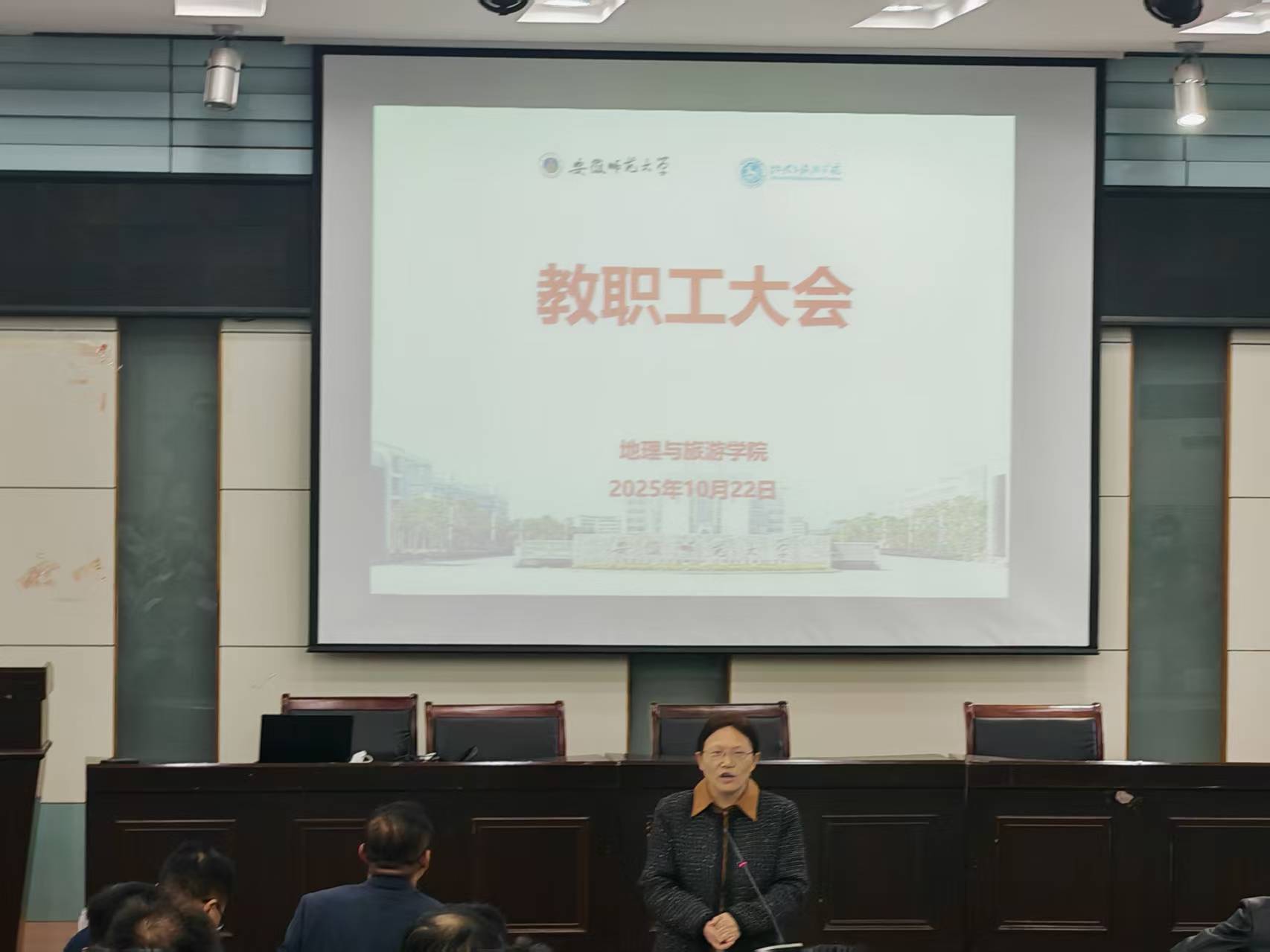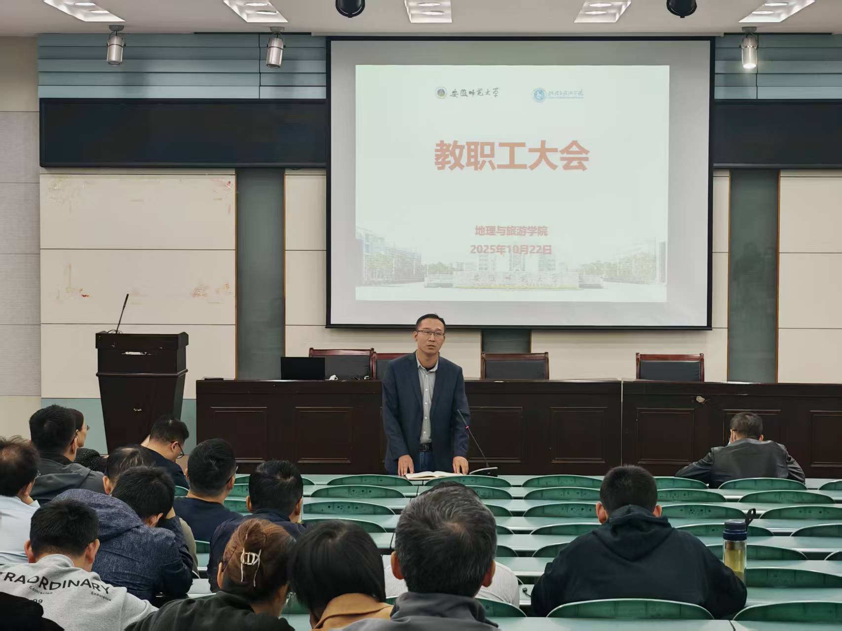 在学院实验楼101报告厅召开教职工大会,学院党政领导班子成员、全体教职工参加会议。会议由院长方凤满主持。