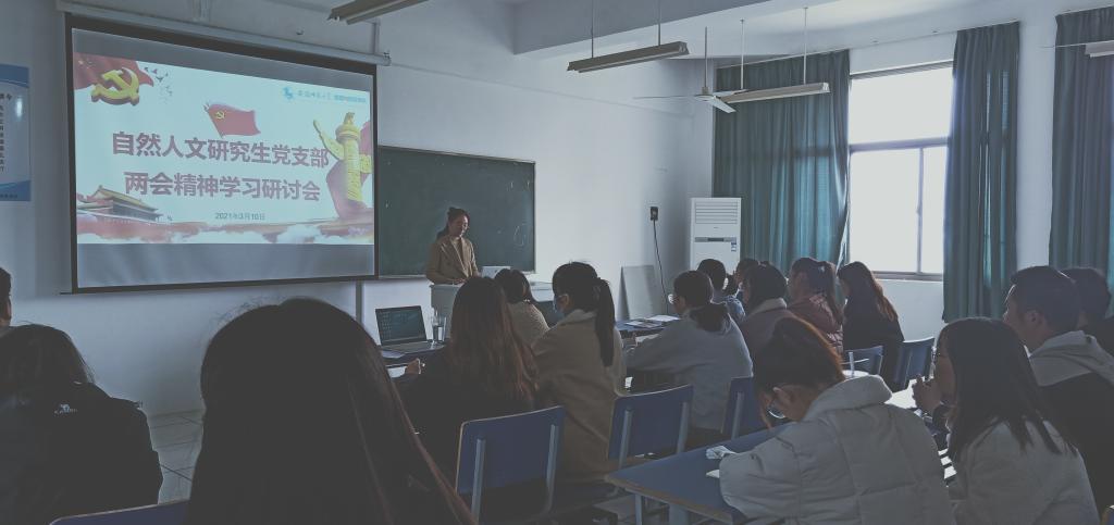 自然人文党支部在3月10日,以两会精神为主题,在学院实验楼301组织开展专题理论学习研讨会。支部全体党员同志均积极参会学习,会议由自然人文研究生党支部书记曹雨主持。