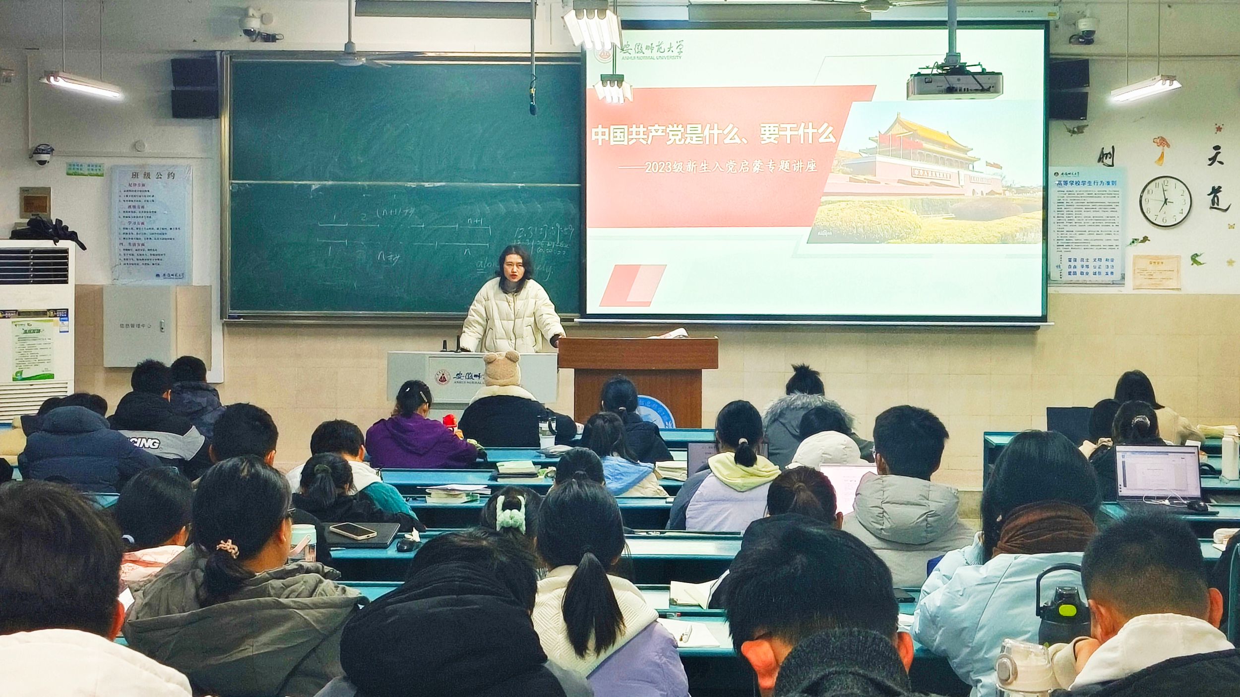 开展“中国共产党是什么、要干什么”专题讲座,从理论和实践相结合、历史和现实相贯彻、国内和国外相关联的维度,为全体新生深入分析了中国共产党成立的时代背景和历史必然,全面论述了中国共产党成立以来团结带领全国各族人民取得的重大成就,以大无畏的牺牲精神和英雄气概通过浴血奋战、建立了新中国,艰苦奋斗、确立了社会主义制度,弃旧图新、开启了改革开放的伟大历程,笃定从容、昂首奋进在伟大的新时代,踔厉奋发、开启全面建设社会主义现代化国家新征程,创造了经济快速发展奇迹、社会长期稳定奇迹,正在以中国式现代化推进强国建设、民族复兴,希望同学们立大志、明大德、成大才、担大任,以实际行动和责任担当把握人生方向、擦亮青春底色、练就过硬本领、肩负历史使命,早日成为一名光荣的中国共产党党员!