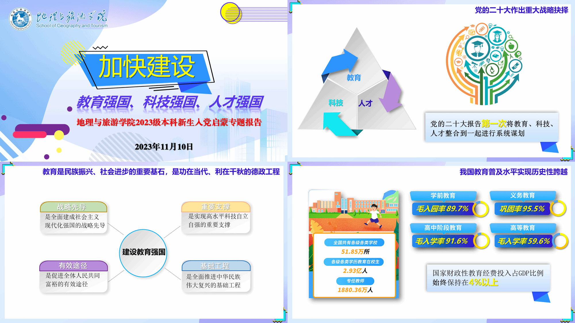 组织“加快建设教育强国、科技强国、人才强国”专题讲座,深入贯彻习近平总书记在中共中央政治局第五次集体学习时的重要讲话精神和党的二十大报告关于教育、科技、人才的重要论述,强调教育是民族振兴、社会进步的重要基石,科技是国家强盛之基、安全之要,人才是实现民族振兴、赢得竞争主动的战略资源。党的十八大以来,教育事业取得历史性成就、发生格局性变化,科技事业取得历史性成就、发生历史性变革,人才队伍快速壮大,人才效能持续增强,人才工作取得创新突破。加快强国建设必须坚持和加强党的全面领导,加快建设高质量教育体系,完善科技创新体系,深入实施创新驱动发展战略,全面提高人才自主培养质量。充分发挥高校的重要作用,持续加强基础科学研究,增强科研创新使命担当,大力推动科技成果转移转化,积极服务国家战略需求和区域经济社会发展,着力建设世界重要人才中心和创新高地,培养堪当民族复兴大任的时代新人。