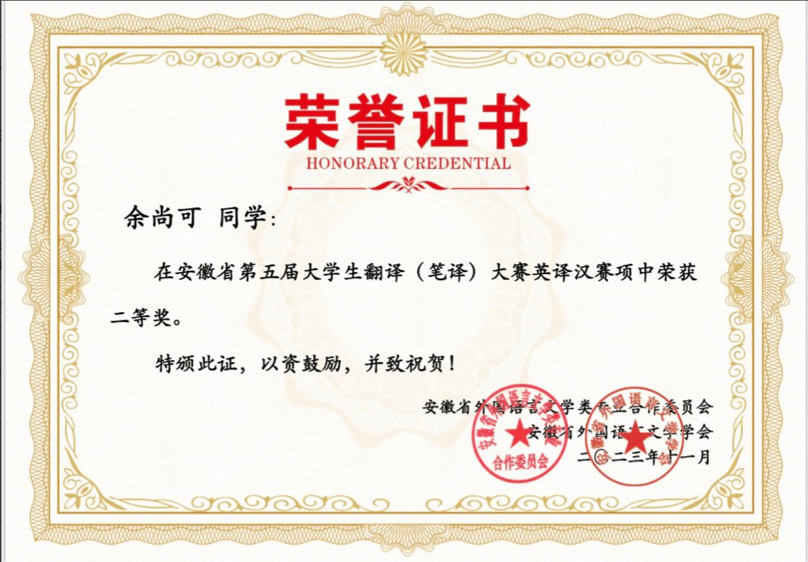 安徽省第五届大学生翻译(笔译)大赛英译汉二等奖