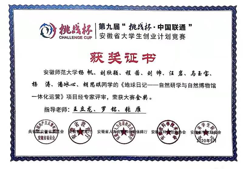 第九届“挑战杯•中国联通”安徽省大学生创业计划竞赛金奖
