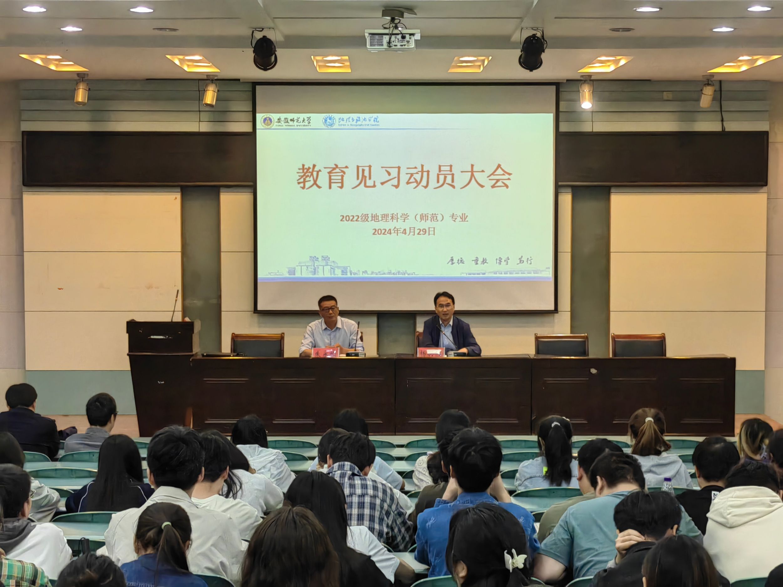 2022级地理科学(师范)专业在实验楼101报告厅召开教育见习动员大会,学院教学副院长杨兴柱、地理科学专业负责人朱永恒、辅导员操晶晶以及相关指导教师和2022级地理科学(师范)专业全体学生参加。会议由朱永恒主持。