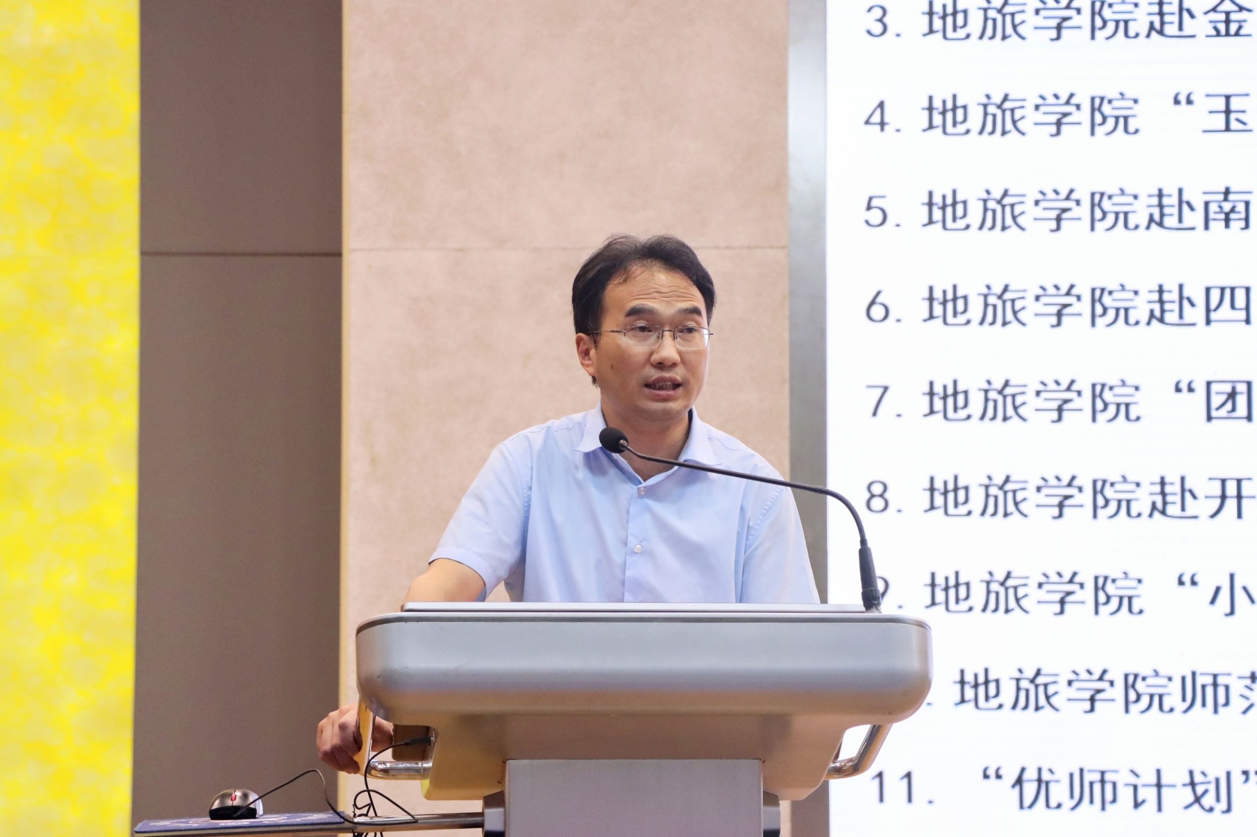 党委书记贾冠忠,副书记付勇,副院长汪文文,副院长杨兴柱,暑期实践指导教师代表、专兼职辅导员和全体暑期社会实践队员到场参加仪式。仪式由2021级地理科学(拔尖人才班)专业蔡子坤和2021级地理信息科学专业姚兰主持。