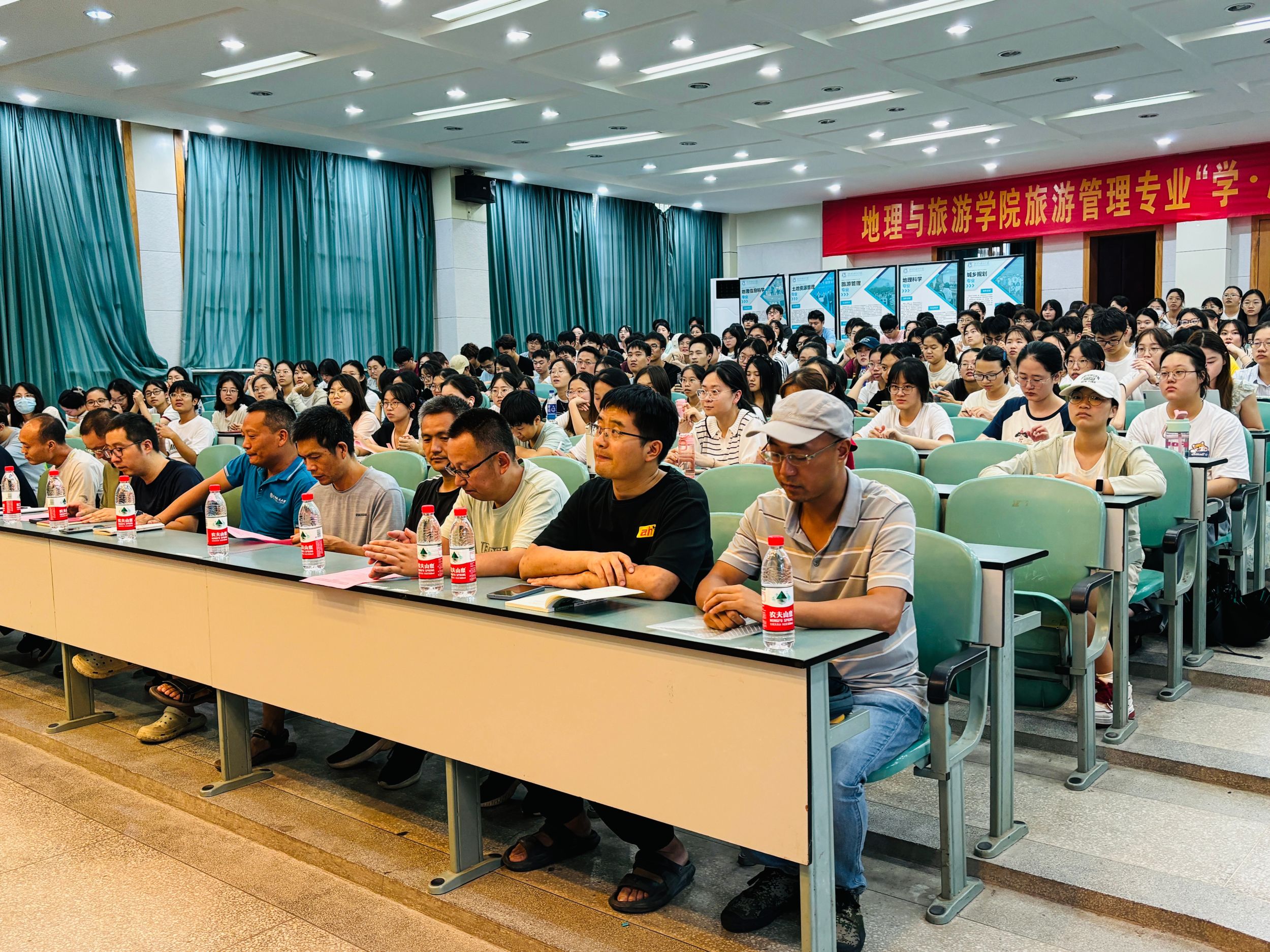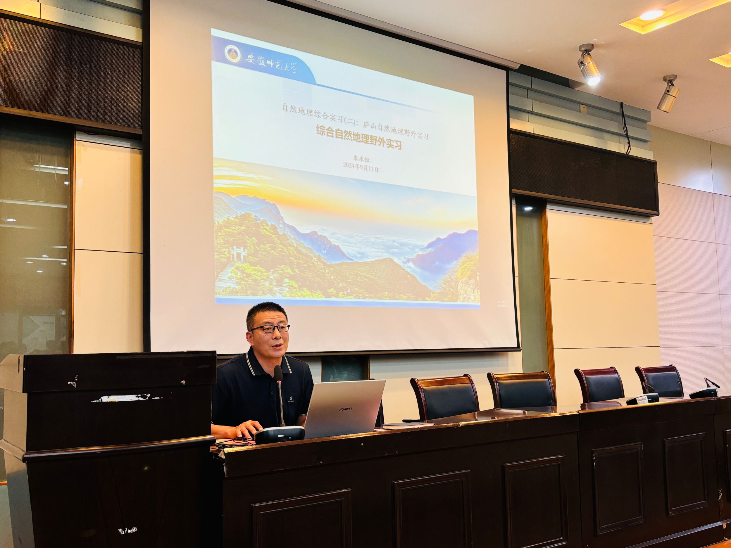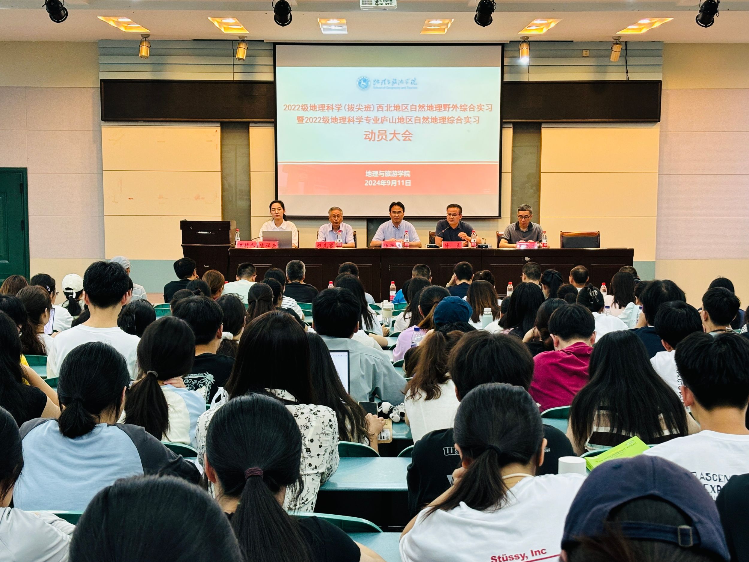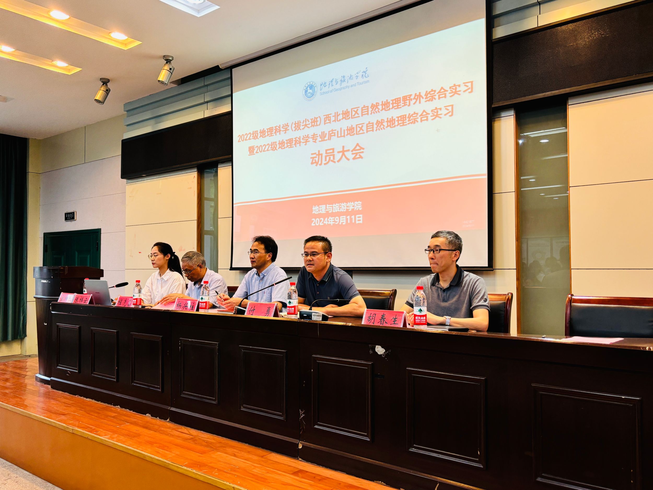 在实验楼101报告厅召开2022级地理科学(拔尖班)西北地区自然地理野外综合实习暨2022级地理科学专业庐山地区自然地理综合实习动员会,学院党委副书记付勇、副院长杨兴柱、地理科学专业负责人朱永恒、西北实习负责人程先富、庐山实习负责人胡春生,全体实习指导老师,以及2022级地理科学(拔尖班)、2022级地理科学(师范)专业全体学生参会,会议由辅导员陈祥云主持。