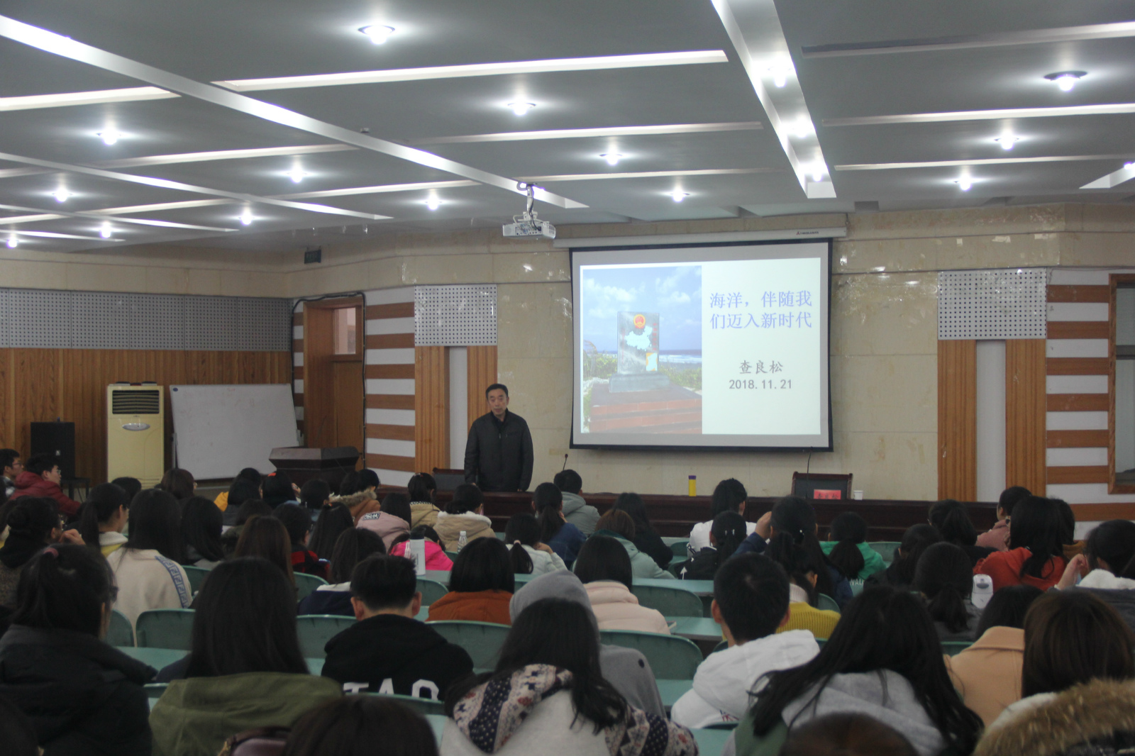 邀请校关工委查良松教授在财务处二楼报告厅为新生做了题为《海洋,伴随我们迈入新时代》的专题报告。地理学大类、旅游管理、城乡规划三个专业全体新生到场聆听。报告会由新生辅导员侯永康主持。