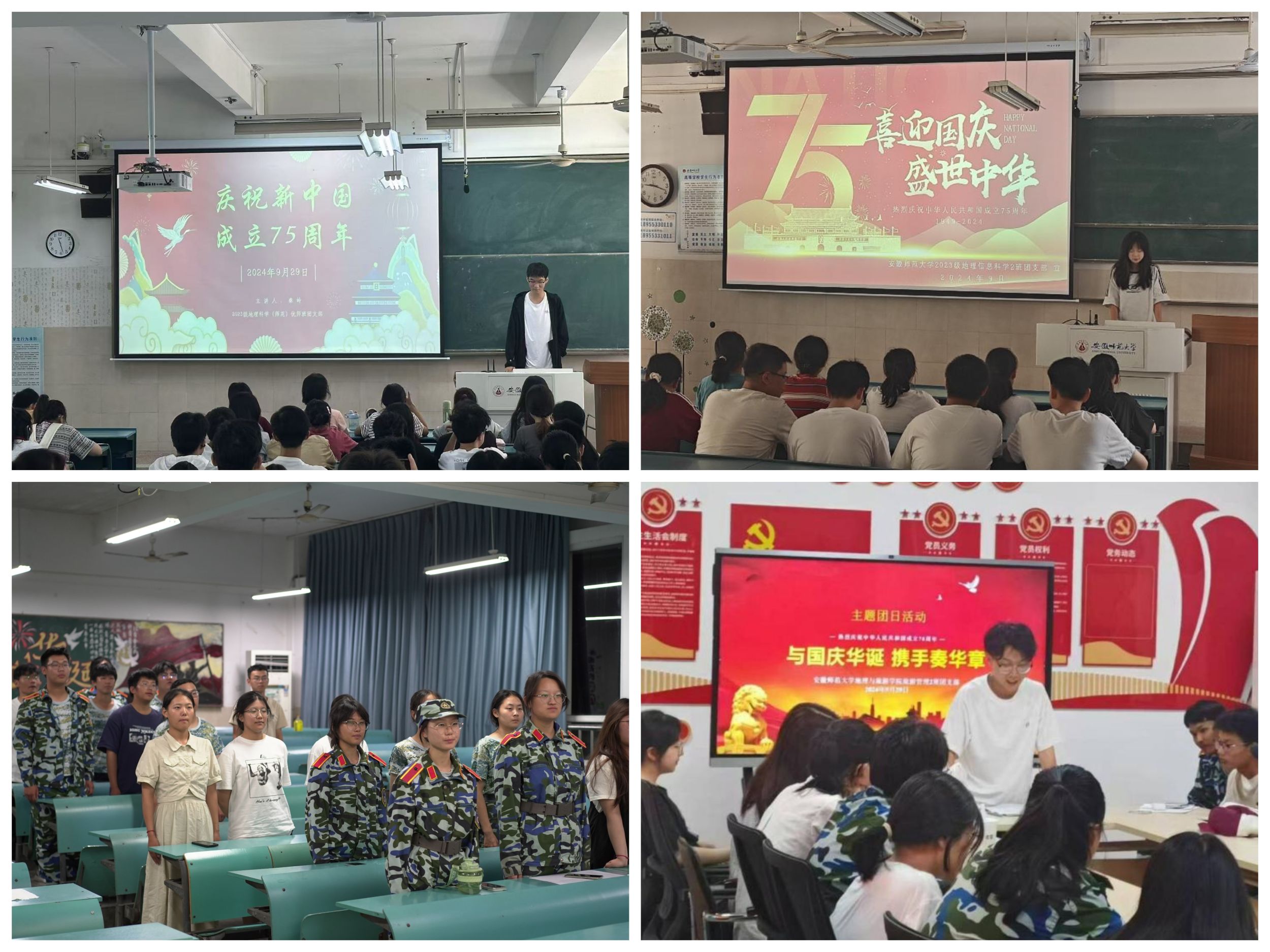 面向各班级团支部,学院开展了“七十五载逢盛世,青春共筑谱华章”主题团日活动,各班级团支部积极参与,主要活动形式包括主题班会、诗歌朗诵、红歌合唱、红色故事分享、观看红色影片、观看中华人民共和国国家勋章和国家荣誉称号颁授仪式等。其中2023级城乡规划专业1班结合专业特色,用CAD绘制国旗为祖国庆生,展现新时代青年的爱国情怀和专业技能;2024级地理学科(师范)2班班级成员则跨越31个地区为祖国录制庆生视频,展现了地旅学子的团结力量和对祖国的深情厚意。