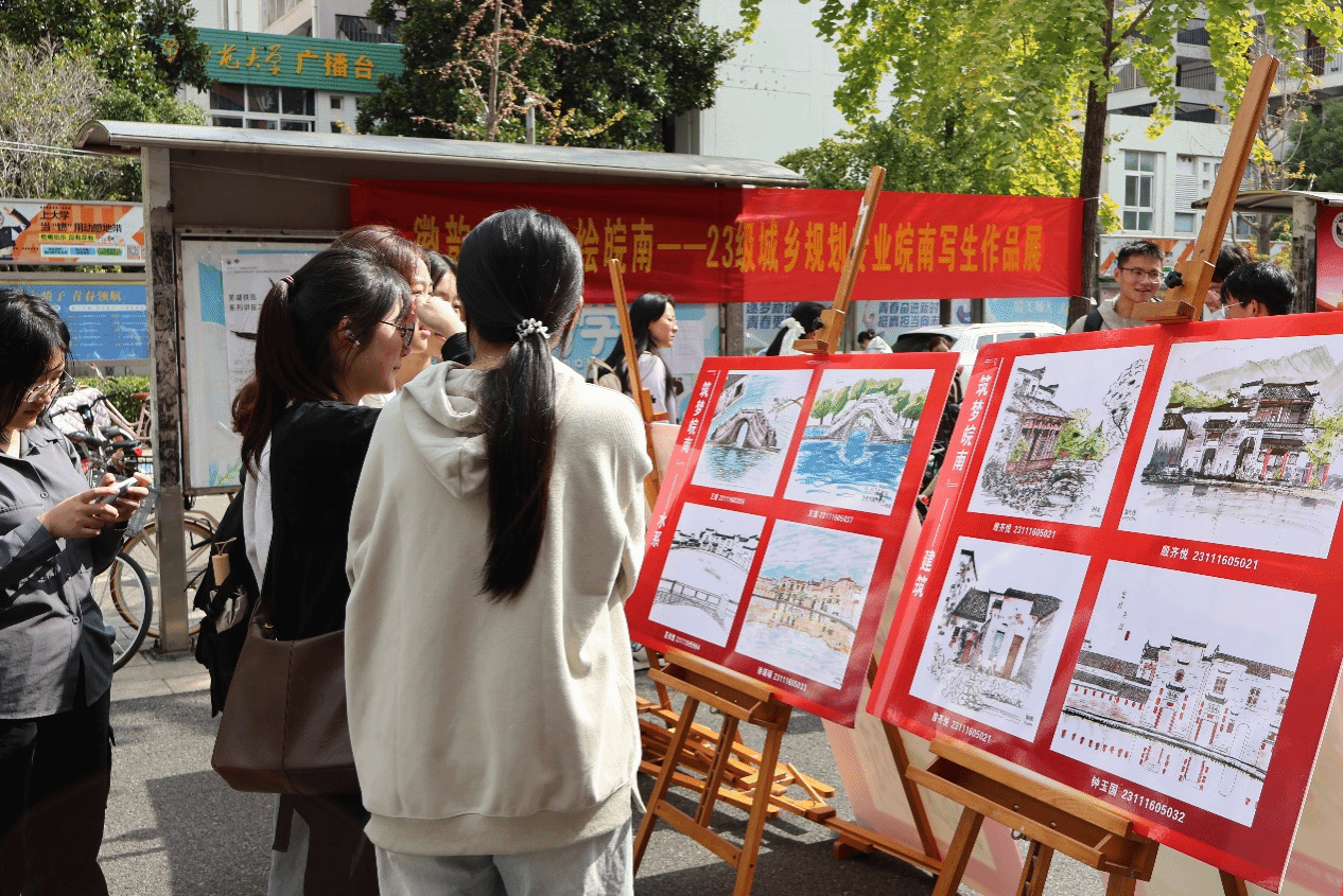 活动现场,共展出了128幅学生手绘作品,吸引了大量师生驻足观赏。同学们热情地给参加展览的领导老师们讲解自己的作品。崔光磊肯定了本次实践教学中文化传承的重要性,并对丰硕的绘画成果给予了高度评价。他表示徽州文化是极具地方特色的区域文化,包含了深厚的文化特色,是学生探究和展开学习的重要资源。方凤满表示学生们从入学时的绘画基础提升到现在的水平,体现了教育教学的成效,见证了学生们的努力与成长。她鼓励大家继续用脚步丈量画里乡村,用双手描绘墨彩皖南,为城乡规划专业的发展贡献自己的力量。