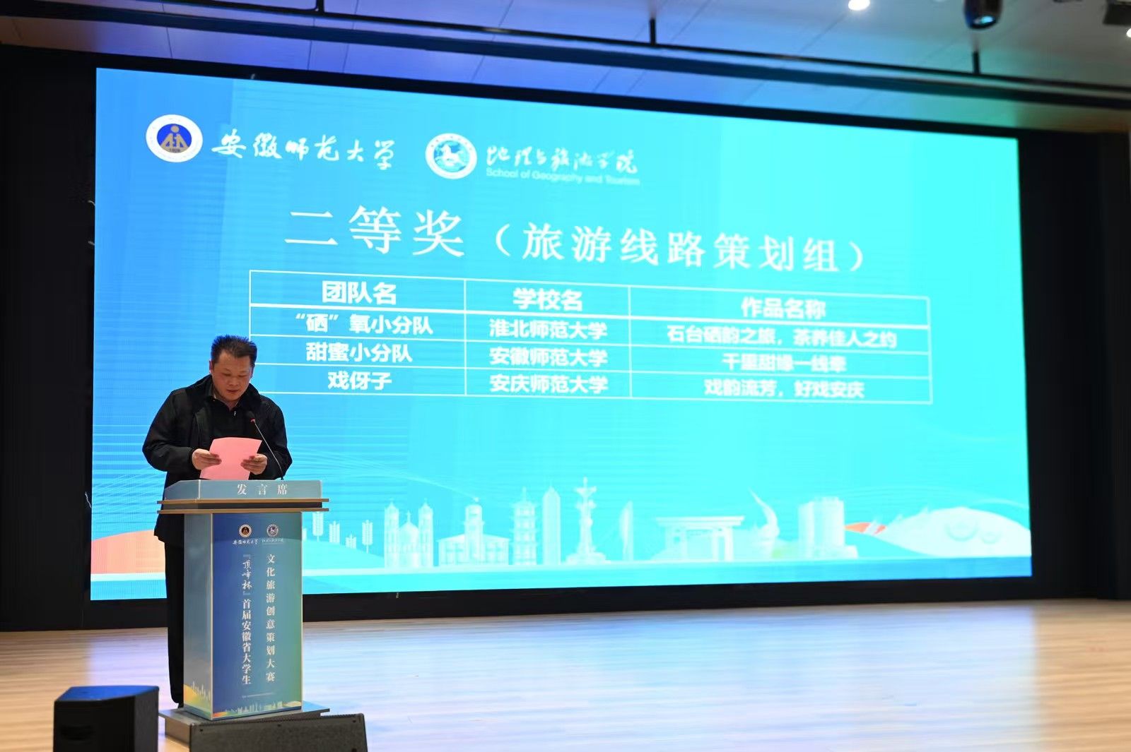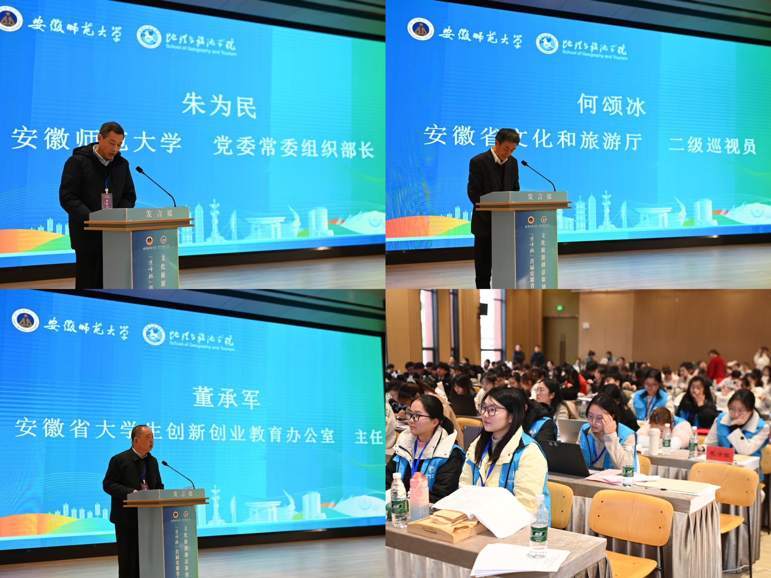 向所有专家评委和参赛师生表示诚挚欢迎,并表示,作为主办单位之一,将为大家提供优质的赛程保障和服务,预祝旅游线路策划、主题旅游产品策划、旅游营销策划三个赛道作品能够精彩展示并为文旅行业发展提供有效建议。何颂冰在讲话中表示,此次大赛以实际行动贯彻落实相关会议与习近平总书记考察安徽精神,希望在各界支持与共同努力下,成为文化旅游创新发展的重要平台、大学生展示自我的精彩舞台。董承军表示,安徽省重视高校创新创业能力建设,期望参赛高校通过比赛提升办学与人才培养质量,为安徽建设做贡献。