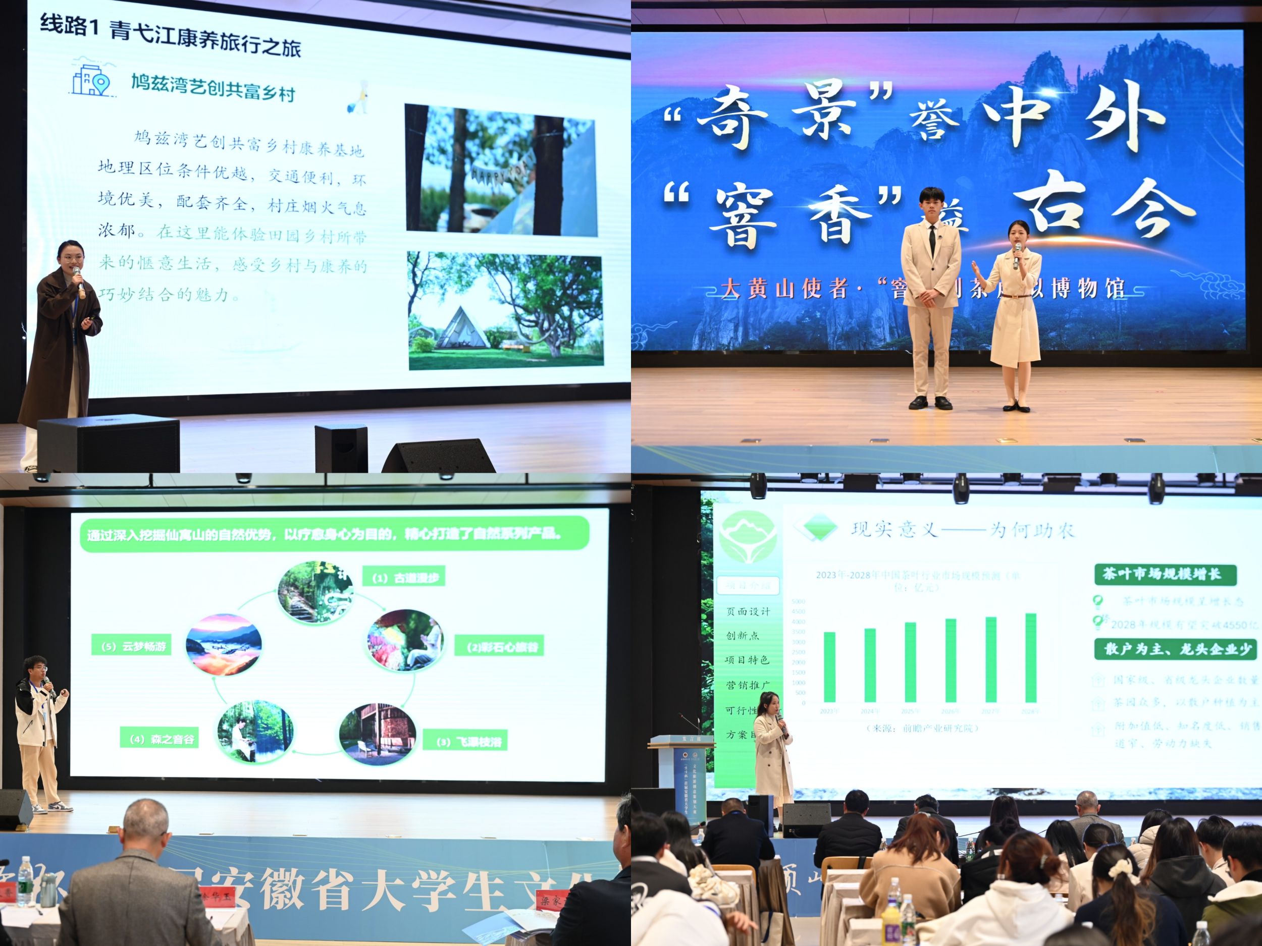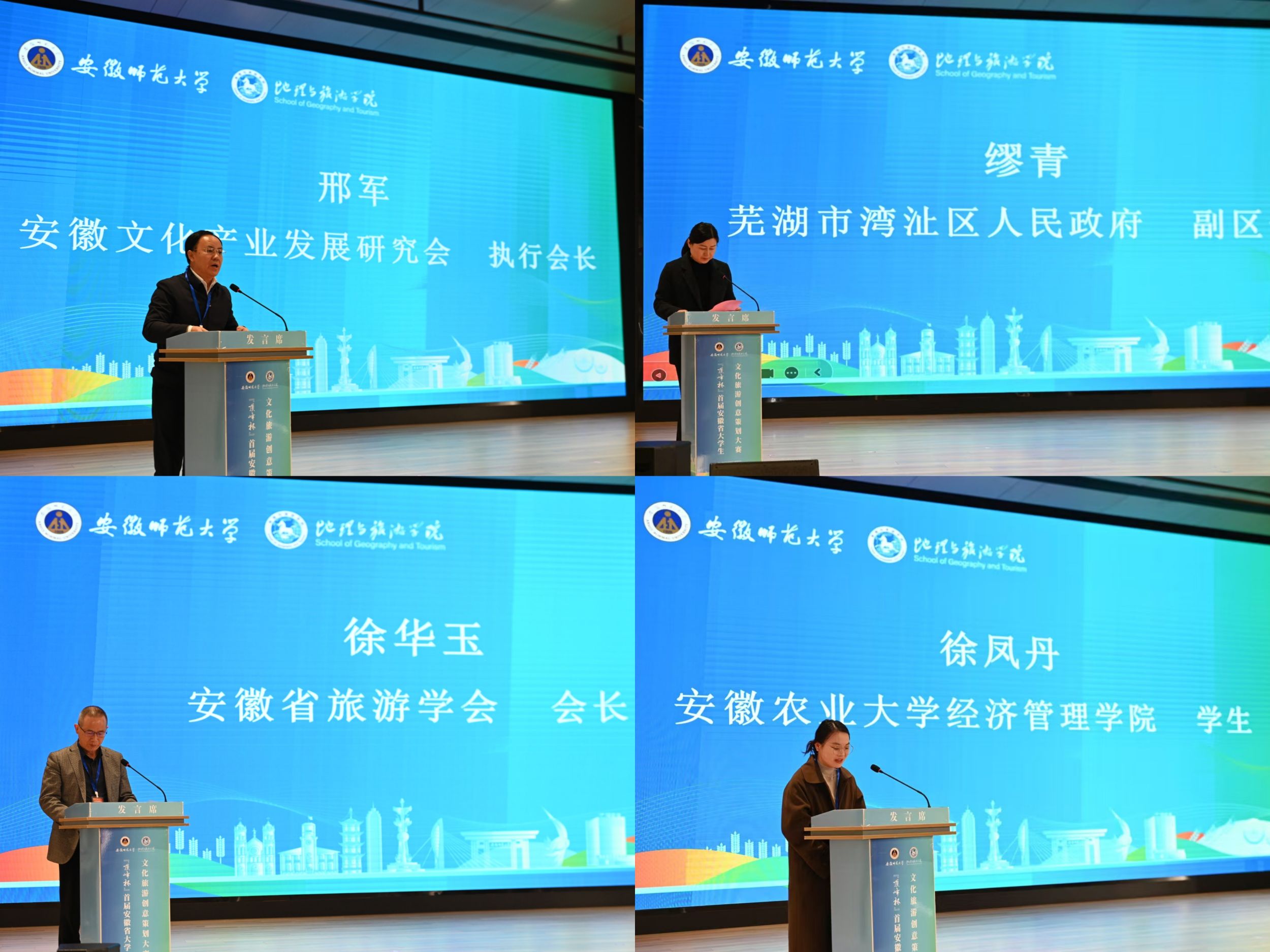 邢军介绍了安徽文化产业发展研究会的基本内容,并表示文旅产业承载国民精神力量与国家软实力,参赛者被寄予厚望,需发挥想象力与创造力,为大众打造多样化、个性化、高品质的文旅产品与服务。缪青表示举办地承载文化传播荣耀,文化与旅游融合助推乡村振兴,与本次大赛初衷契合。徐华玉作为本次大赛评审组组长发表讲话,他先是向参与赛事组织、评审工作的领导、专家以及积极参赛的同学们表达诚挚感谢,随后介绍评审组专家成员的确定和工作要求。参赛团队学生代表、安徽农业大学经济管理学院徐凤丹分享了自己从初赛到决赛的经历与感悟,并代表参赛团队承诺严格履行要求,强调比赛是发现与成长之旅,会全力展示团队风采。