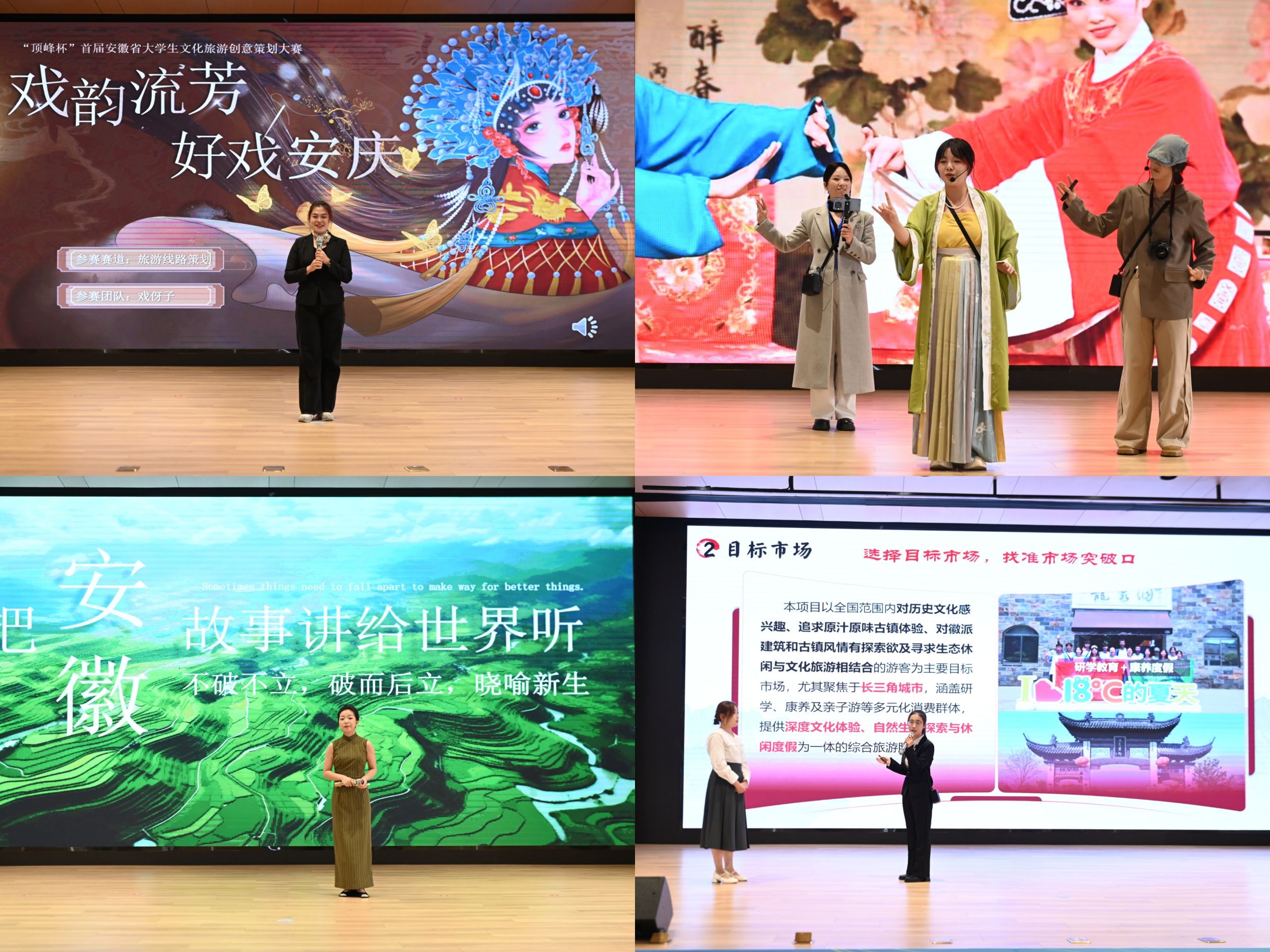 决赛环节,参赛选手依次按照旅游线路策划、主题旅游产品策划、旅游营销策划三个赛道顺序展开汇报。旅游线路策划赛道共有十组选手参加,主题旅游产品策划赛道共有十组选手参加,旅游营销策划赛道共有九组选手参加。参赛选手们围绕安徽省内各地市优秀传统文化、红色文化、旅游特色等基础,通过创意设计,从主题定位、市场分析、创意理念、产品设计、市场营销、财务分析等各个方面展示了自己团队的创意主题,作品充分考虑将传统和现代科技融合、文化和旅游融合、市场和产品对接,具有较强的时代性和可行性。评委老师们结合参赛作品进行即兴提问,参赛学生沉着冷静、条理清晰的回答充分展示了当代大学生对专业知识的应用、对文旅发展的认知探索和文旅策划的无限创意。