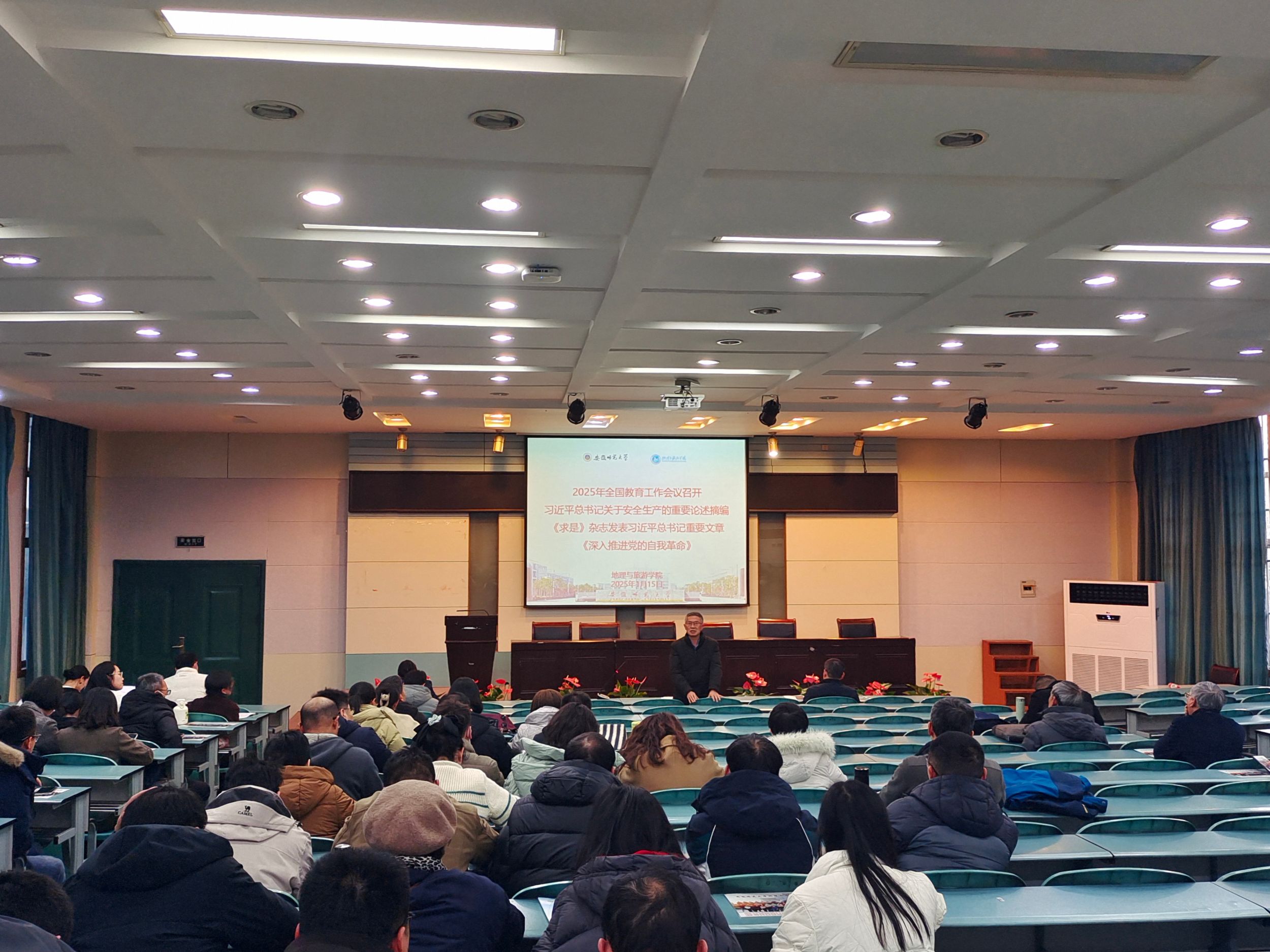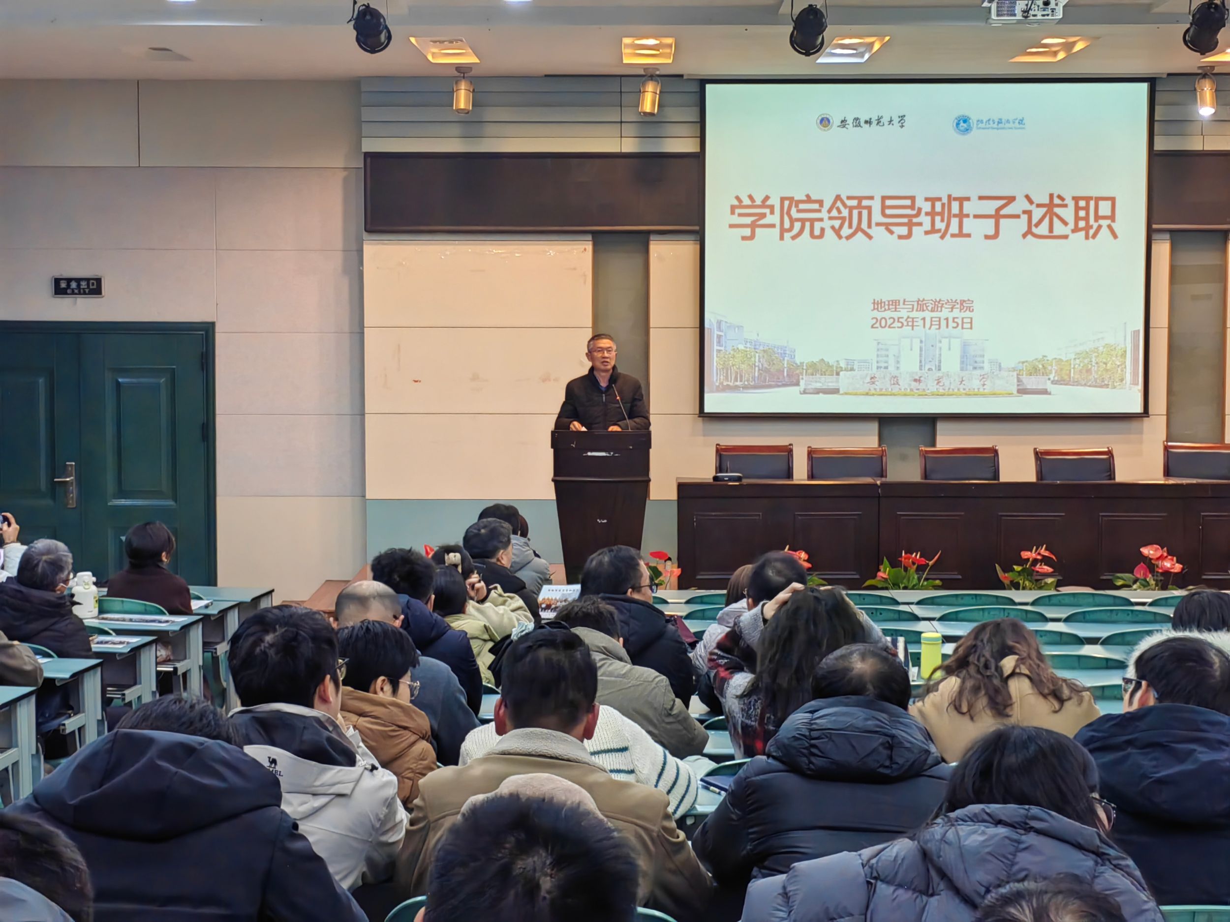 在实验楼101报告厅召开全院教职工大会,领导班子和领导人员进行2024年述职报告,并就寒假有关工作进行专题布置。学院全体教职工参加会议,会议由院长方凤满主持。