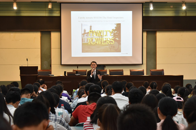 李国雄以洲际酒店的知名度引出“酒店人的定义与责任”这一话题,又通过经典电影片段再现向同学们解释了懵懂服务员和专业酒店人的区别,打破了许多同学困扰已久的专业误区。李国雄还讲述了自己作为酒店人的奋斗经历,列举了生动有趣的真实事例,表明酒店行业是一个知识面广、专业要求高、发展速度快的行业,劝诫同学们勿要好高骛远,需要脚踏实地,以饱满认真的态度对待自己的专业。