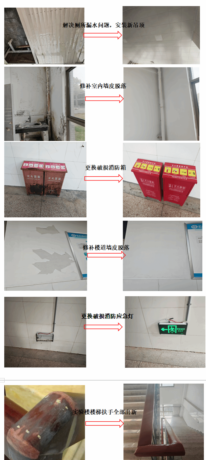 近日,为进一步营造良好育人环境,学院组织开展了为师生办实事系列活动。在学校总务处、保卫处等部门的积极支持下,对实验楼老旧墙体、楼道路灯、消防设施等进行了修缮更新。下一步,学院将对实验楼多媒体教室的老旧设备进行升级更新,并会同总务处对实验楼内庭进行改造。