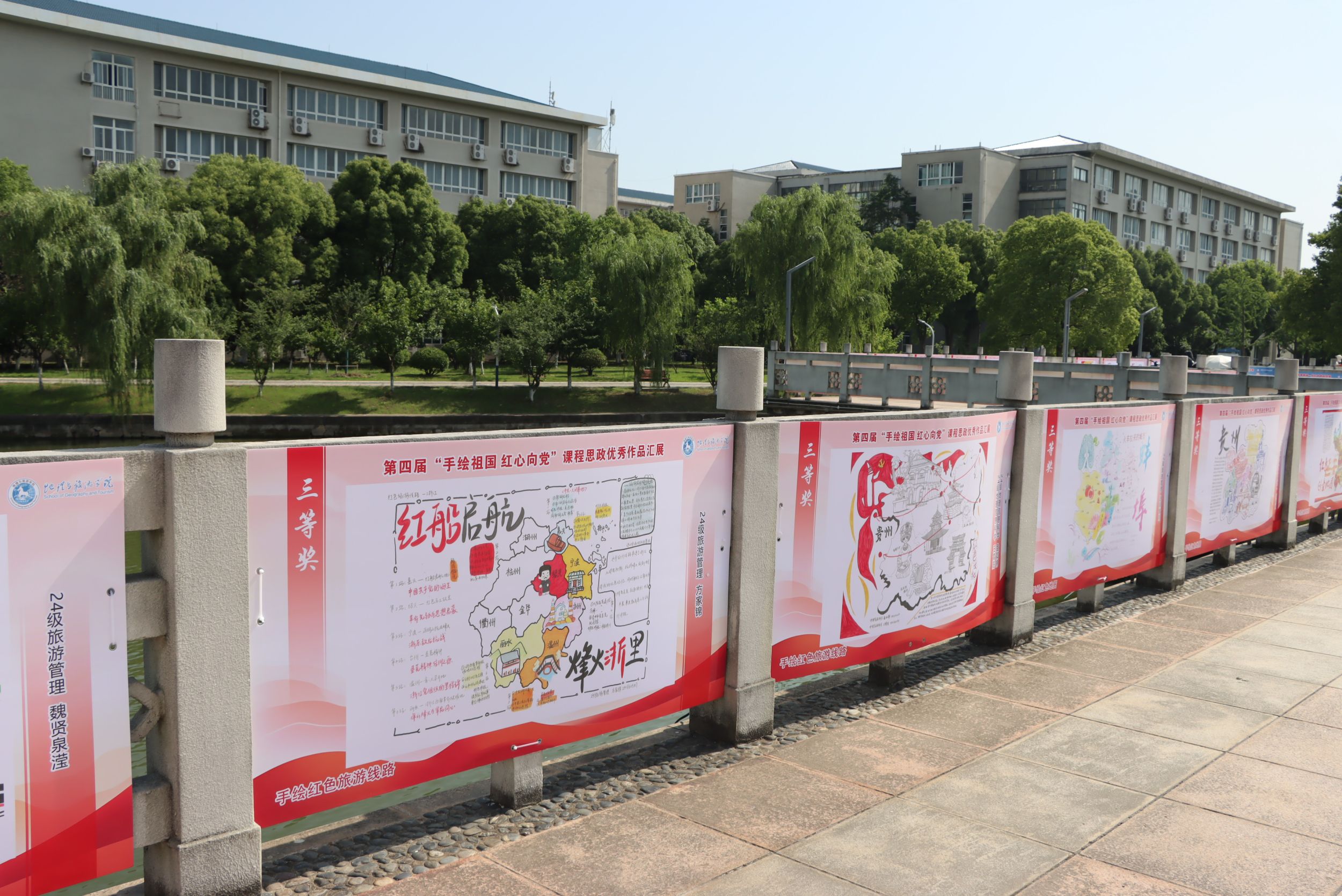 本次活动以“手绘祖国山河,共筑红色梦想”为主题设置三大特色赛道,为创作者搭建多元展示平台。其中,“手绘行政地图赛道”聚焦家乡情怀,鼓励参赛者以细腻笔触描绘家乡省市规范行政地图,用地理视角展现地域风貌与人文特色;“手绘红色地图赛道”以创意为笔,围绕红色省域及地区,通过新颖独特的艺术表达,生动再现革命历史场景;“手绘红色旅游线路赛道”则立足红色资源活化利用,参赛者需系统梳理某地区红色旅游资源,精心规划设计兼具教育意义与游览价值的主题旅游线路,并以可视化地图呈现。三大赛道既突出专业性,又融入思政元素,将专业实践与思政教育深度融合,充分激发参赛者创作热情,为“手绘地图 红心向党”主题注入全新活力。经专业评审,40件优秀作品脱颖而出,在九曲桥集中展出,吸引了众多师生驻足观赏。