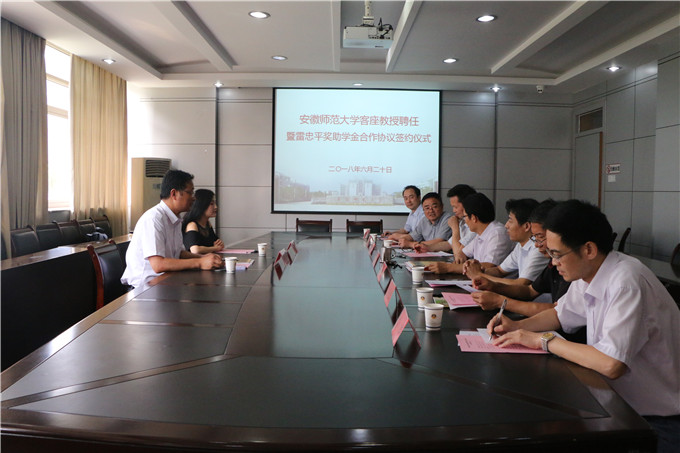 客座教授聘任暨雷忠平奖助学金合作协议签约仪式在学校行政楼第三会议室举行。安徽科蓝特铝业有限公司、广德县星汉房地产开发有限公司董事长雷忠平、合作部经理张美玲,我校党委副书记、校长张庆亮,校人事处处长朱为民,校教育基金会项目管理部部长郑金泽、基金会秘书苏军,地旅学院领导班子成员出席聘任仪式。仪式由地旅学院院长苏勤主持。