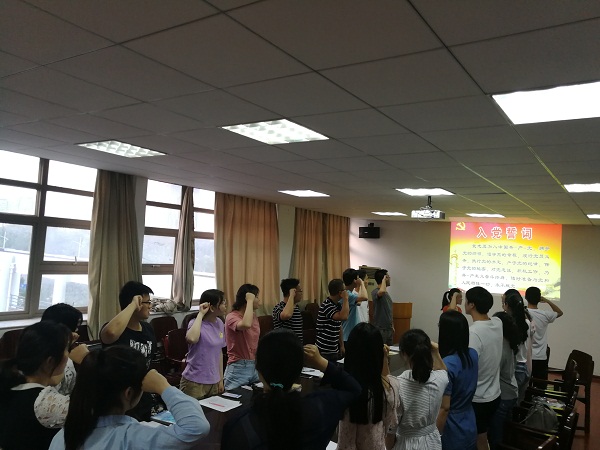 接下里全体党员重温入党誓词,在领誓人的带领下,全体党员怀着激动的心情,举起右拳,用激昂的声音作出了对党的承诺。