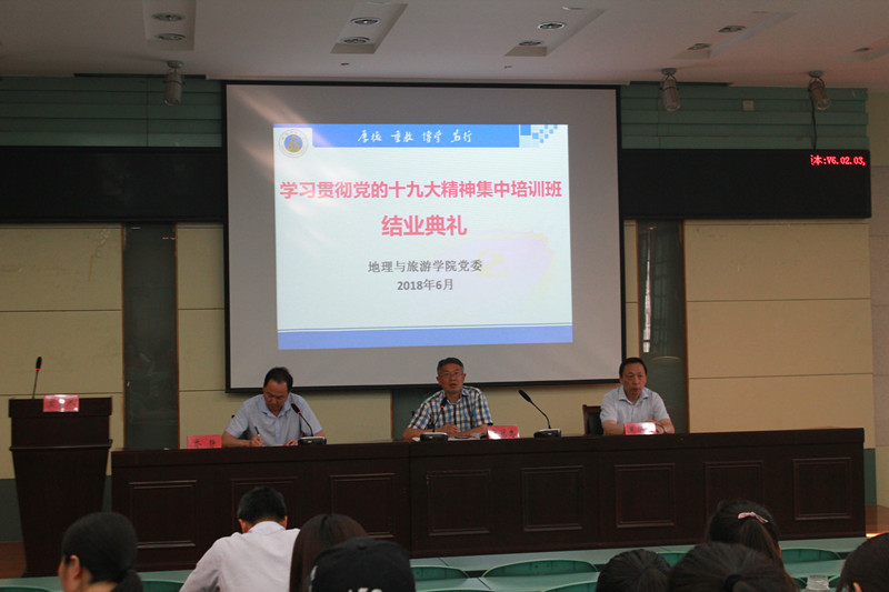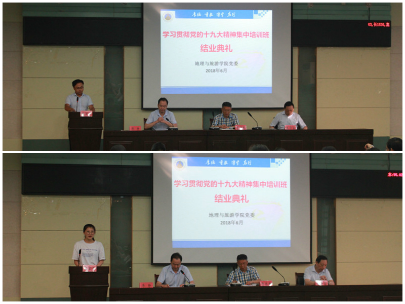 本次培训班历时两个多月,培训对象囊括全院277名师生党员同志。结业典礼上师生党员代表先后汇报学习情况。其中地理信息系教工党支部书记汪左作为教师代表,分别从精神层面、理论层面、实践层面结合自己的切身感受,表示通过此次培训班的学习自己收获丰富,今后将以基层党支部标准化建设为契机,进一步加强学习贯彻党的十九大精神,践行党的十九大精神对基层党务工作者的要求,认真履行党务工作者的职责,为本学科的发展贡献自己的力量。随后,2015级旅游管理专业杨颖作为学生代表,通过回顾整个培训过程,表示此次培训班的针对性和实效性,切实增强了大家对十九大精神的学习贯彻领悟能力,同时使我们对党有了更加深刻的认识,也更加坚定了我们在实践中践行为人民服务的步伐和发挥好党员示范引领作用的信心。