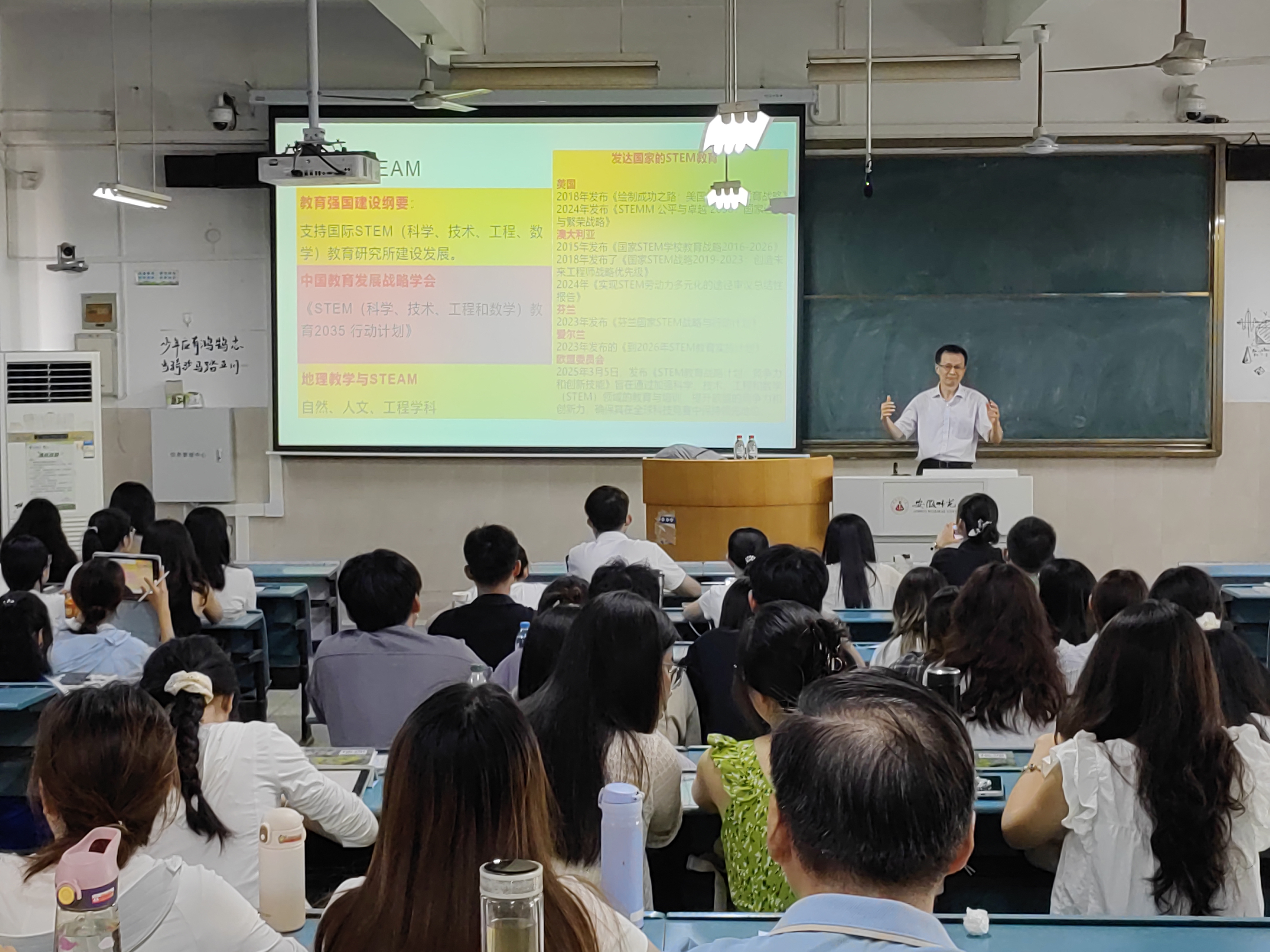 接着,方小培重点从“主题选择:求真求实”“如何实施:课堂内外”“知行创的逻辑”等方面,结合一线教学案例和丰富教学经验,详细讲解了如何将STEAM教育理念有机融入地理教学。他以月相研究为例,在实践研究环节引导同学们使用A4纸逐步完成月相演示仪的制作,通过与同学们互动进一步阐述该实验所蕴含的地理知识,鼓励大家在今后教学中要富有行动力和创造力,敢于创新和勇于尝试。