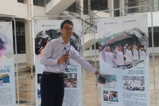 现场展览分为十年故事和优秀志愿者典型事迹两个部分,前者以11块精美展板以年为单位描述十年以来的支教活动内容,后者则重点展示了优秀志愿者的动人事迹。十年支教的故事未曾间断,118位支教志愿者接踵而来,受益的山区留守儿童多达473人,支教团队先后在四川达州、南充、凉山等山区建立4个支教点。团队构建了较为完整的支教志愿者招募和培训体系,并结合当地特点,不断优化课程结构,从基础课程辅导拓展到防震减灾、心理疏导等多种形式结合的“七彩课堂”。早期受支教的儿童中已经有10余名考上了本科院校,并有4名学生加入到支教团的队伍中来,支教故事的传承变得更加有温度。2017年,“川皖学堂”线上支教项目自此正式启动。一年来,团队累计支教130余课时,27个孩子从此告别了语文、数学单调重复的课程表,项目受到了《中国教育报》、教育部官网的专题报道。团队涌现出2017年全国优秀共青团员王阳等优秀志愿者典型。