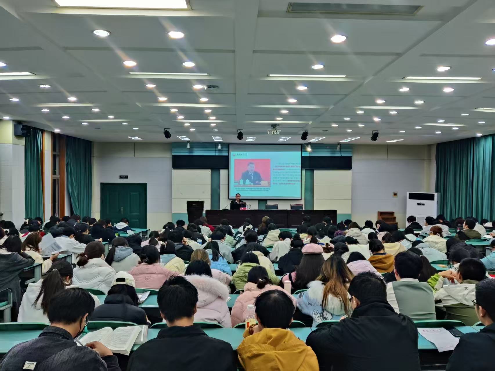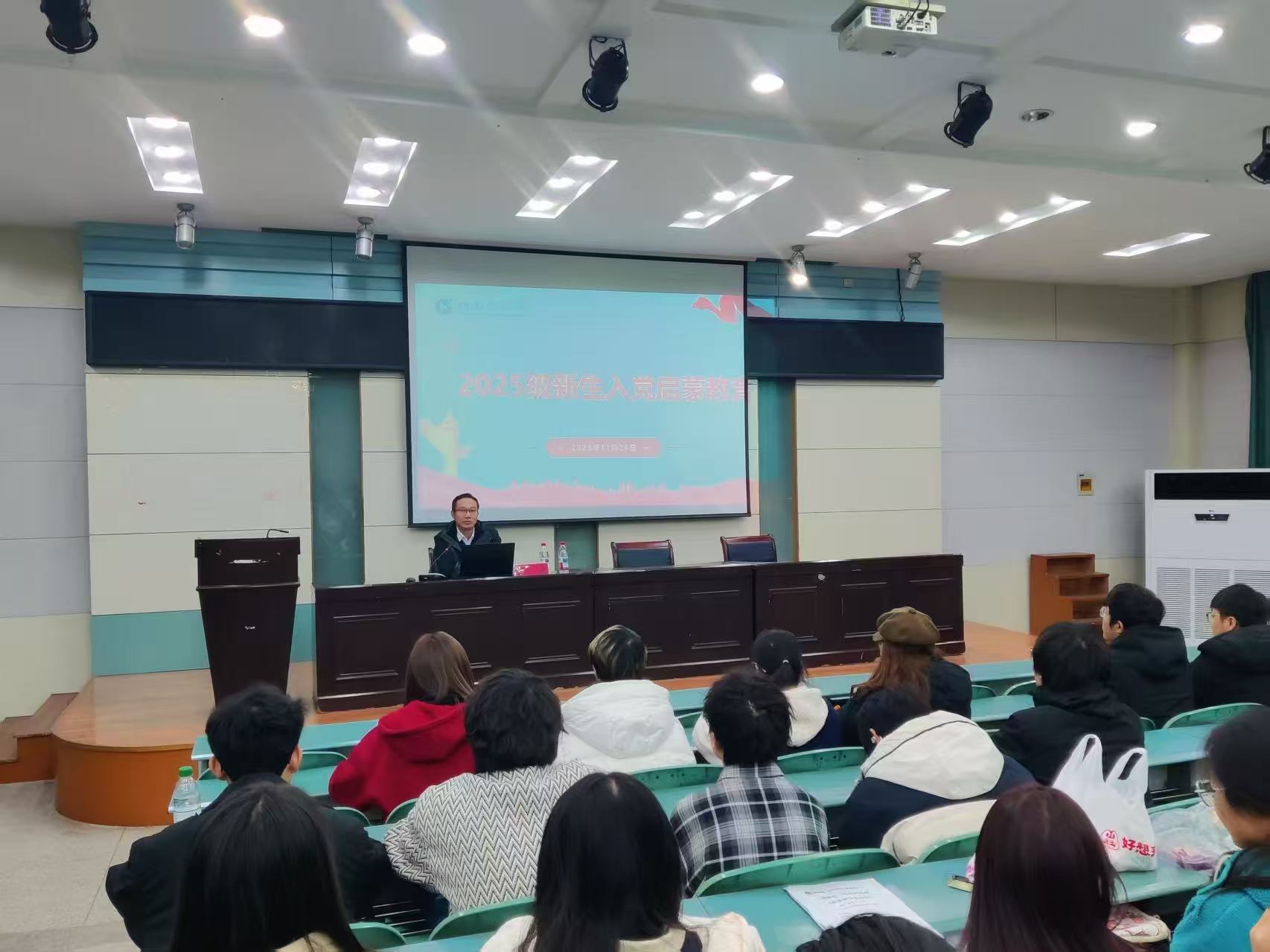 在实验楼101报告厅举办2025级新生入党启蒙教育专题讲座。本次讲座由学院党委书记张顺主讲,辅导员韩红豆主持,2025级全体本科新生参加。