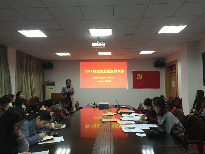 20171127日晚7点,国旅学院旅游本科生党支部在学院行政楼三楼会议室召开2017年发展党员党支部大会,全体在校正式党员、预备党员参会,部分入党积极分子旁听观摩学习,会议由党支部书记王美主持。