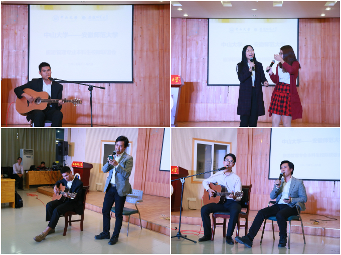 本科生校际联谊会。中山大学旅游管理与规划系主任左冰副教授、副主任刘逸博士、国旅学院党委副书记乔静等领导老师出席了联谊会,两校学生相间而坐,以更加轻松活泼的形式深入交流。两校2015级旅游管理专业的班长分别为对方佩戴上自己学校的校徽,象征着长江之滨的师大学子和珠江之畔的中大学子结成互信互助的朋友。随后,两校师生将精心准备的文艺节目一一呈现,国旅学院精心准备的茶艺节目《高山流水》博得满堂彩,一壶清茶用以招待远方来访的朋友;国产精品