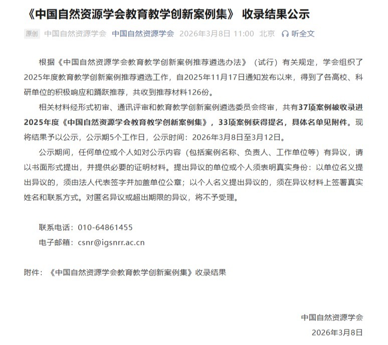 2026年3月8日,中国自然资源学会公示2025年度教育教学创新案例收录结果,国产精品