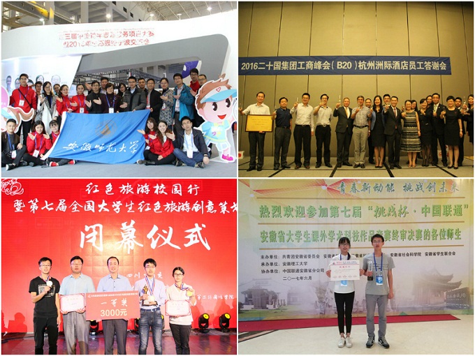 -浙江开元酒店管理集团有限公司“管理类国家级大学生校外实践教育基地”,基本上形成了“教学-实习-实践-就业”一站式“四基地”建设。三是巩固实践育人成效。“情系川皖,圆梦巴蜀”山区留守儿童支教项目获评第三届中国青年志愿服务项目大赛全国银奖、安徽省金奖,10余支暑期实践团队获评团中央、国家旅游局等国家级立项或表彰,学生志愿者500余人参与了2016杭州二十国集团G20、B20峰会、中国自然资源学会2016年学术年会等国内外重大活动,获得集体或个人表彰200余人次(项),人民网、中国新闻网等100余家新闻媒体报道了相关活动,学院连续多年获评校级暑期实践优秀组织奖;学生在各类学科竞赛中收获颇丰,相继获得联合国环境规划署学生挑战活动全球荣誉提名奖、第九届“挑战杯”全国大学生课外学术科技作品竞赛三等奖、国家旅游局第七届全国大学生红色旅游创意策划大赛一等奖、第二届全国公众科学素质电视大赛团体冠军、Esri杯中国大学生GIS软件开发竞赛特等奖、首届中国高校地理科学展示大赛一等奖、第二届全国高校地理师范生教学技能竞赛一等奖、全国大学生英语竞赛特等奖、全国旅游信息化大赛一等奖等国际、国家级和省级以上奖项500余人次。