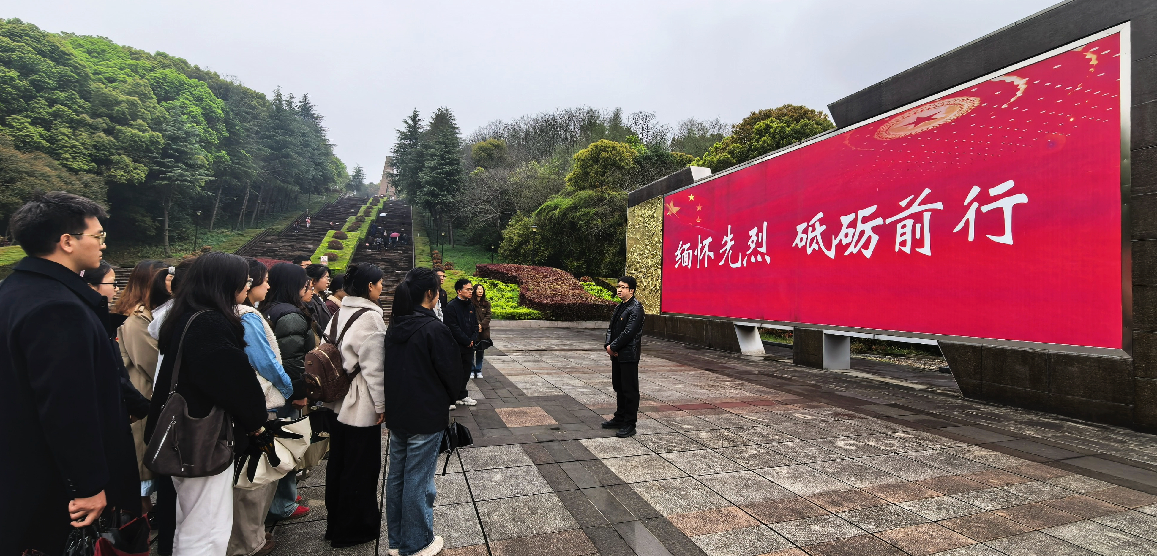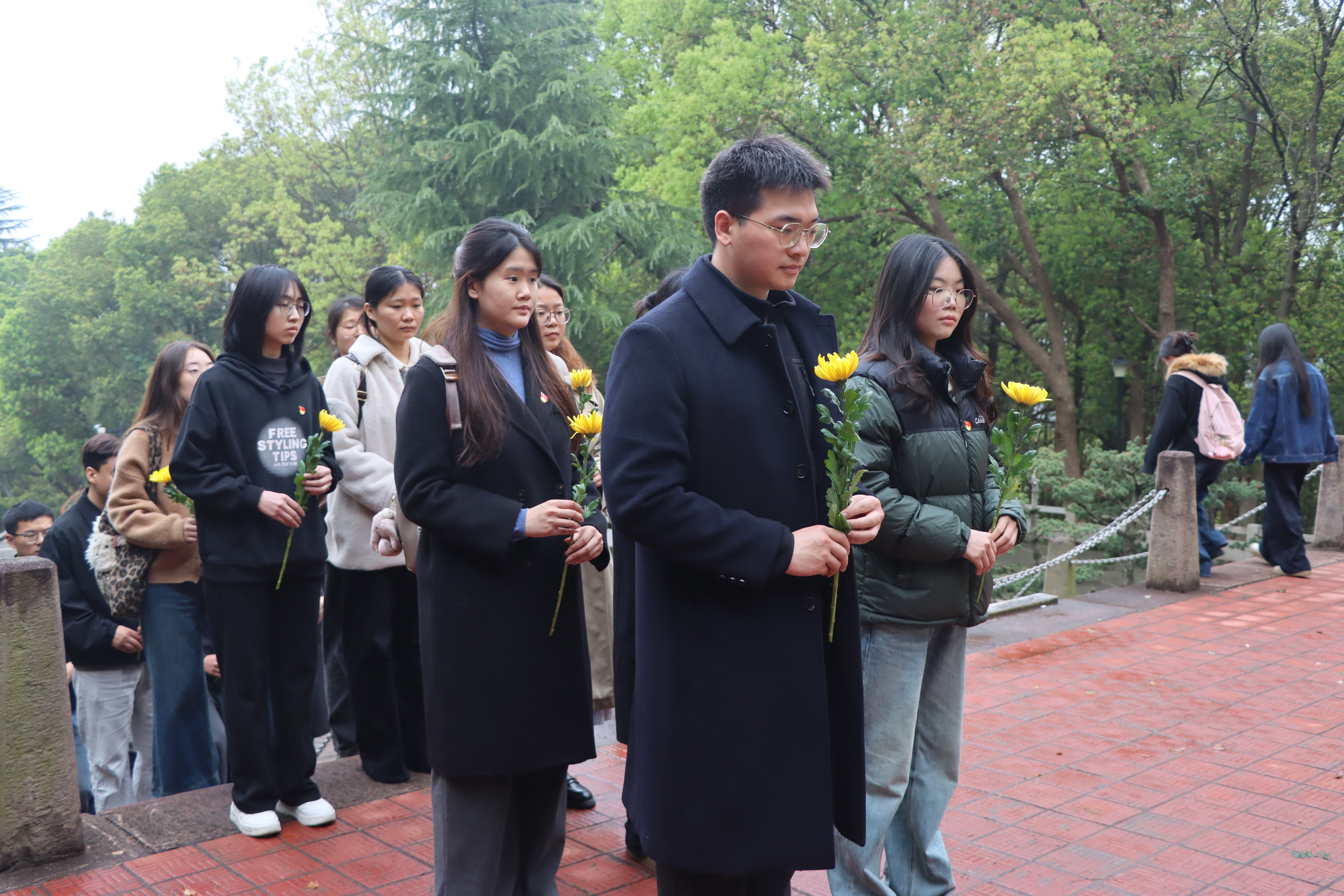 全体师生在细雨中前行至革命烈士纪念碑前。正面镌刻着“革命烈士永垂不朽”的纪念碑巍然矗立,诉说着那段峥嵘岁月。在庄严肃穆的气氛中,全体师生向革命烈士默哀三分钟,行三鞠躬礼,深切缅怀为民族解放和新中国成立英勇献身的革命先烈。随后,师生代表依次缓步上前敬献鲜花,素洁的花朵静静绽放,寄托着对先烈的深切缅怀与崇高敬意。同学们纷纷表示,通过此次活动,更加深刻理解了今天的幸福生活来之不易,将以革命先烈为榜样,珍惜韶华、勤奋学习,将小我融入大我,把青春献给祖国,不负青春、不负韶华、不负期待。