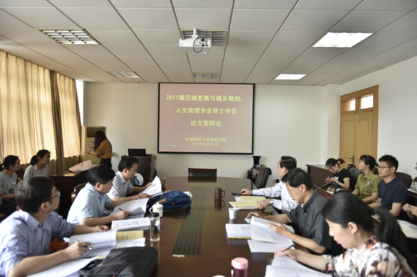 的焦华富教授、杨兴柱教授、赵春雨教授、李俊峰副教授以及韩玉刚副教授作为答辩委员。此次答辩的学生包括区域发展与城乡规划专业的三名同学以及人文地理专业的四名同学。现场旁听人员达到30余人。