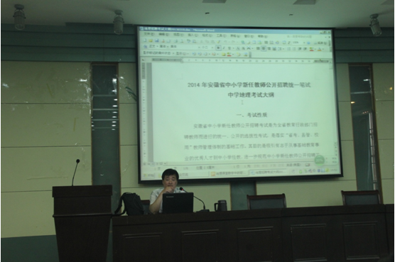李老师从目前研究生的就业状况开始,分析了就业压力大的内外因素,并详细讲述了安徽省中小学新任教师公开招聘统一考试——中学地理考试大纲的主要内容以及笔试和面试中应注意的系列问题。讲座重点讲述了地理课堂上教学理念转换、教学方式转变、教学环节设计、板书设计等问题;注重以学为主的基本思想,强调以学生为主导,师生共建的课堂教学模式。