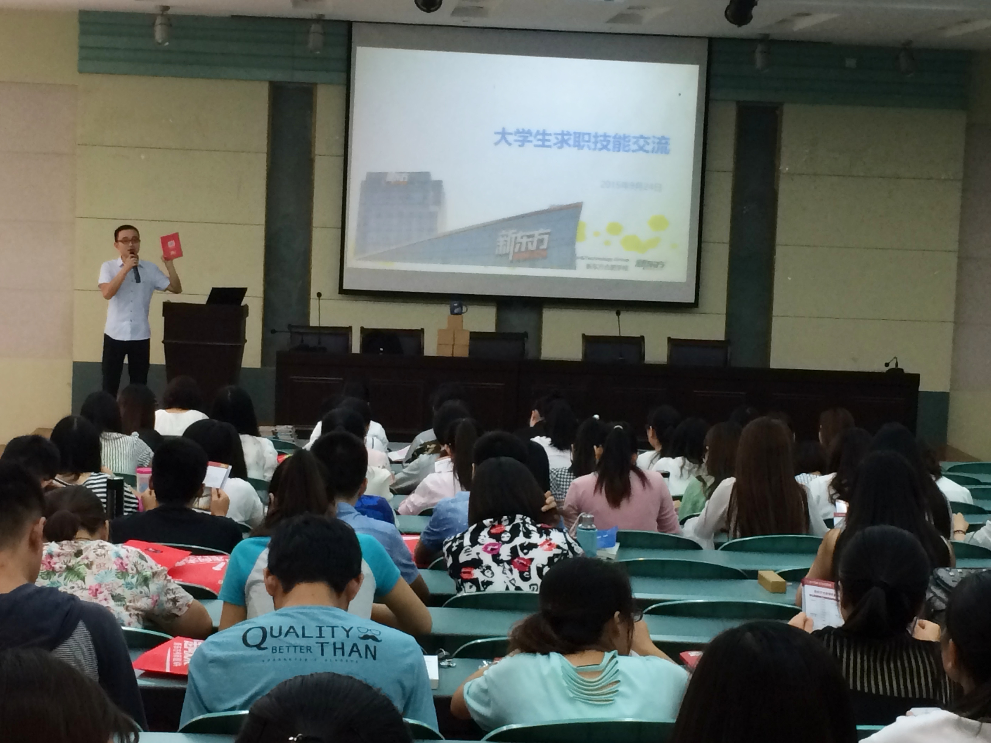本网讯(国旅学院 徐明露)职旅天下早扬帆,推进就业善作为。9月24日,国旅学院邀请新东方教育科技集团(合肥学校)人力资源总监随从标先生一行来校举办本学期学院首场校园就业宣讲会,该院2016届全体毕业班辅导员和学生参加了宣讲会。
