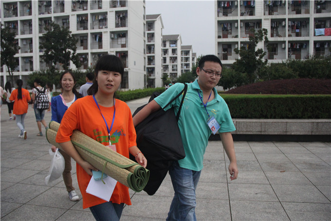 新生宿舍楼分布较散,不易寻找,注册结束后,志愿者们便自觉担起送新生入寝室的重担。他们都微笑着向新生介绍学校情况,从校园景色,到专业特色,再到学院风采……一言一语,彰显学院学子优秀素养;一举一动,代表师大文明礼仪。学长们为新生提行李、领卧具,带新生认超市、银行、食堂。从南体育馆到新生寝室,再到大学生活动中心,这条线路,志愿者们不知走了多少遍。虽然累,却快乐着。
