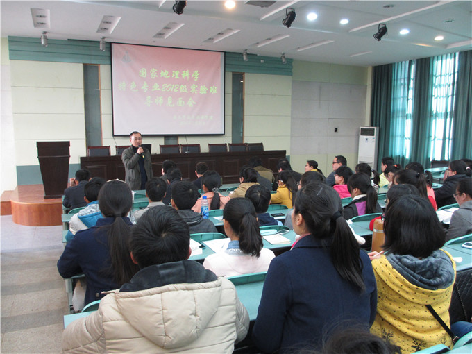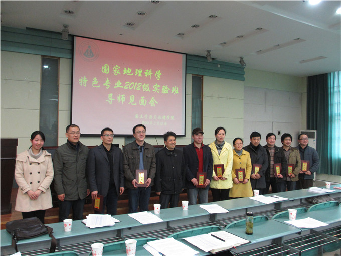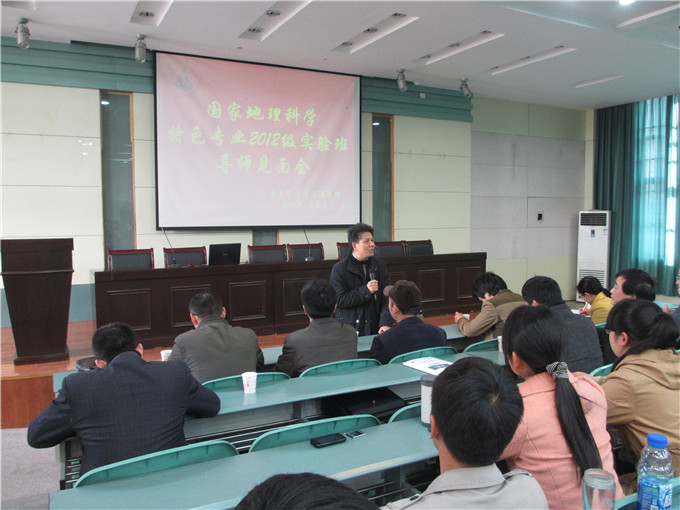 2014年3月15日,国家地理科学特色专业2012级实验班导师见面会在实验楼101举行,国家地理科学特色专业建设点负责人、校科研处处长陆林、院党委副书记罗振、地理系主任方凤满、校外导师李志、马辉陵、余保华、校内导师张平究、朱永恒、李俊峰、沈非、高超及辅导员张玥出席本次大会。