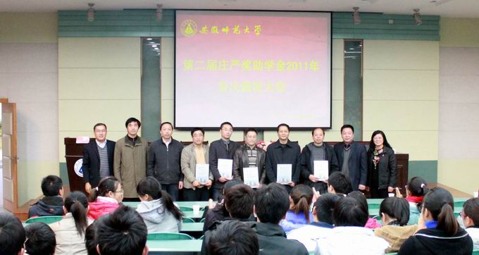 首届庄严奖助学金三年感恩回顾”的视频短片,重温庄严基金会首届三年来的大善义行。接着,校学生处副处长李娟宣读了《第二届庄严奖助学金2011年获奖受助学生名单》,获奖、受助学生代表相继发言。随后,奖学金和助学金获得者上台领取庄严奖助学金,并与领导嘉宾合影留念。庄严基金会代表庄明福先生发表了言简意赅、意味深长的讲话。他强调做慈善的理念:只想做事,不能作秀。基金会坚持不懈做慈善只有一个目的,就是希望通过自己的微薄之力把社会资源给予需要帮助的人,为社会做事情。同时,庄总表达了对所有受助学子的期望,希望他们能感恩社会、回报社会。一番朴实真诚的话语展现了一名成功企业家对贫困大学生的鼓励与关爱,现场的每一位获奖受助学子都为之深深感动。