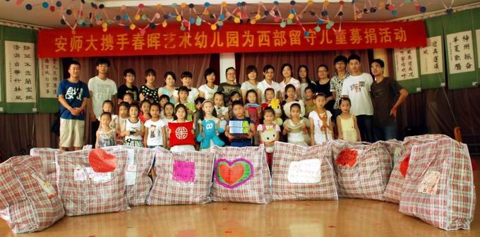 2011年“永远跟党走,青春献祖国”大学生暑期社会实践活动的号角已经吹响,国旅学子携手芜湖市春晖艺术幼儿园,为即将奔赴“四川、贵州、云南”三支援建支教团队开展“安师大携手春晖艺术幼儿园为西部留守儿童募捐”活动,为援建支教团队筹得丰厚物资,成果斐然。