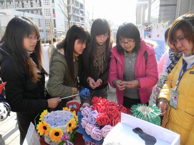 第六届寝室文化节成果。作品内容丰富、形式多样,其中有可爱的“海宝”展板,五颜六色的瓜子拼成的兔子,大米、绿豆拼成的“斯人轩”,彩纸折成的玫瑰花、菠萝等等。精美的展板和手工艺品吸引了很多同学驻足欣赏,他们纷纷称赞展品新意十足。
