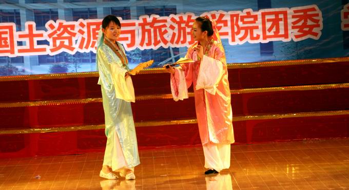 晚会在齿轮乐队富有激情的表演中拉开了的帷幕。二胡钢琴合奏《赛马》,民族舞《花溪 花溪》为晚会涂抹上华丽的色彩,演绎出大学生的青春与浪漫;活力四射的现代舞和扣人心弦的武术表演,给人以视觉上的震撼,不仅使观众欣赏到动感之美,更让人感受到大学生朝气蓬勃的精神风貌;小品《都是QQ惹的祸》更是将晚会推向了高潮,此次晚会的演员不仅有学生,老师也积极的参与进来,让整台晚会惊喜连连,由梁燕老师等表演的配乐诗朗诵《我们一起笑着哭着长大》就是以追忆大学四年生活的点点滴滴为素材而所创作的,饱含深情的朗诵让在场的每一位观众为之感动。歌曲串烧,戏曲连唱,女生独唱等精彩纷呈的节目使晚会高潮迭起。最后在优美动听的大合唱《让世界充满爱》歌声中,晚会落下帷幕。
