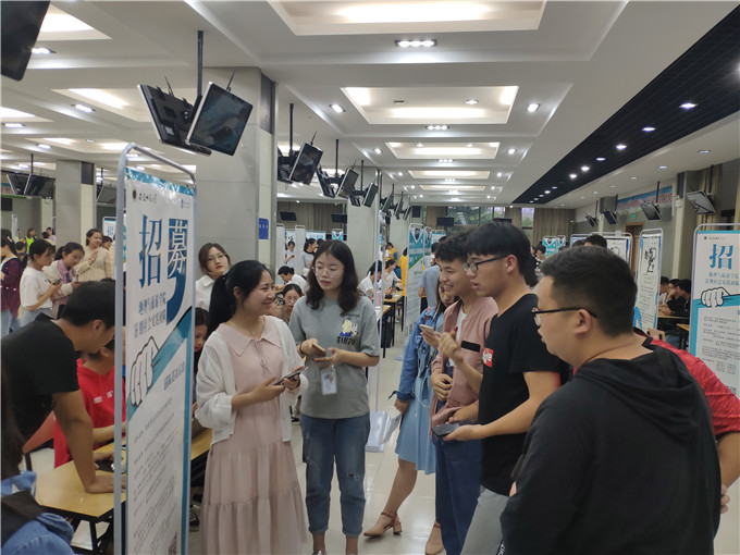 2019年暑期“三下乡”社会实践活动团队招募双选会在大学生活动中心二楼招聘大厅圆满举行。学院50余支团队和800多名同学直接对话,递收简历,相互交流。校团委副书记刘长生、院党委副书记乔静和院团委班子全体成员到场指导。