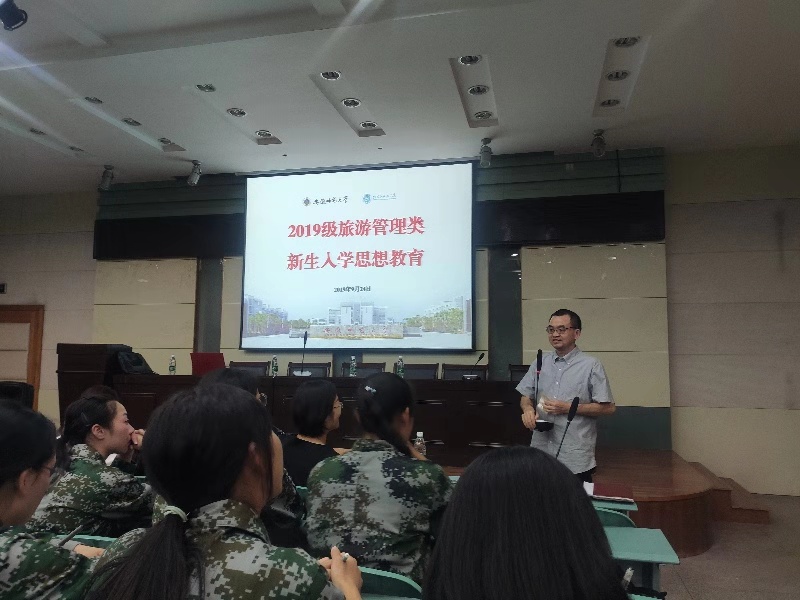 旅游管理专业负责人、博士生导师杨效忠教授主讲。杨效忠向同学们全方位介绍了学院简史、人才培养方案、专业人才毕业发展方向、专业实践与科研平台,重点强调了外语应用能力、创意策划与学术研究等能力的培养,及批判性思维、价值判断思维的培育要求。