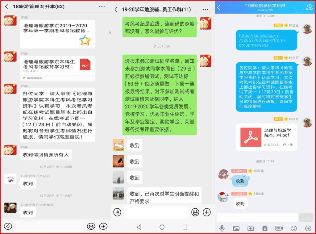 进行在线宣传,营造良好氛围。为进一步推进学生考风考纪教育,学院各年级专业辅导员通过QQ、微信等网络新媒体,开展线上专题教育,切实把考风考纪工作抓在手上,落到实处,提高了同学们的思想认识,端正了考试态度,营造了诚信考试、诚实做人的良好氛围。