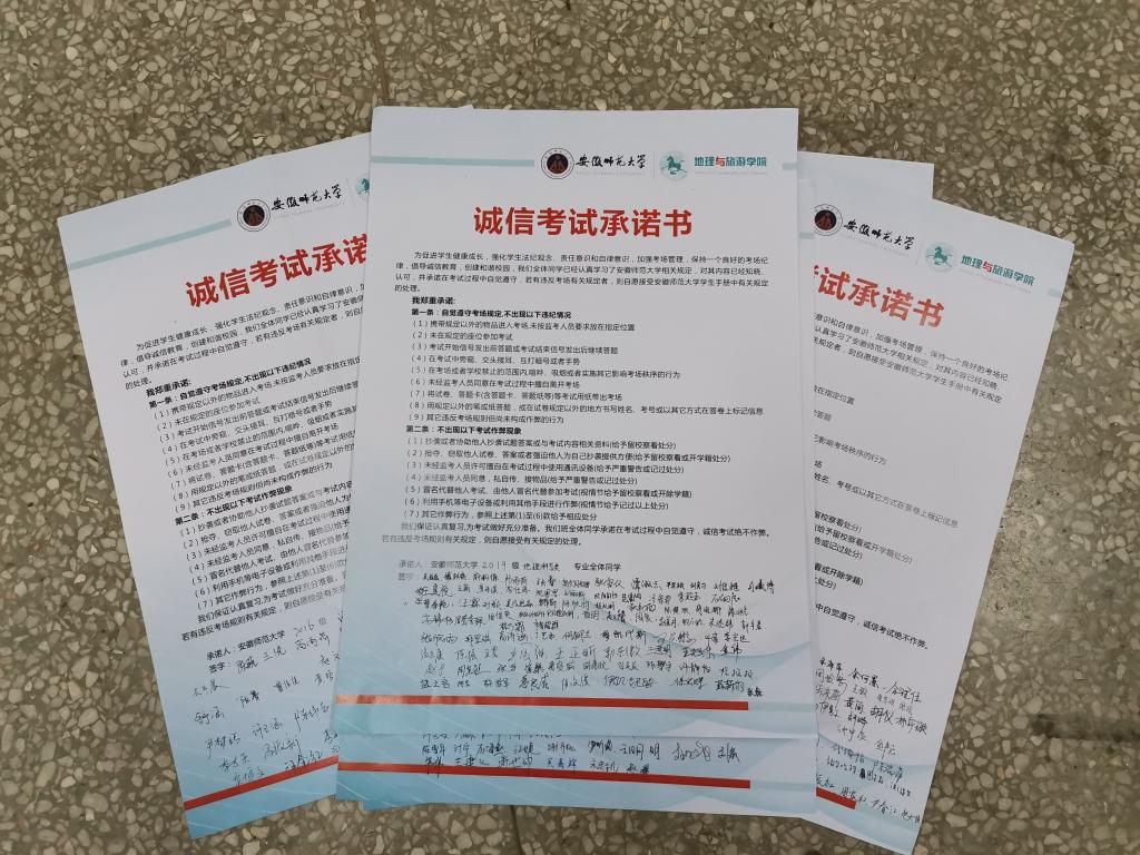 承诺诚信考试,规范考试纪律。为进一步实现“零作弊、零违纪”的目标,学院各班级在传达学校、学院诚信考试文件精神的基础上,所有学生认真阅读了诚信考试承诺书,对个人、班级、学院、学校作出承诺,践行诚信考试承诺,自觉遵守考场规定,杜绝违规违纪行为的发生。