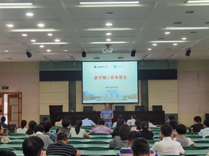 9月2日下午,学院在实验楼101召开新学期工作布置会,院领导班子和全体教职工参加会议。各分管领导分别对新学期的重点工作计划进行了解读,对开学初的工作进行了具体布置。院长苏勤对学院上半年工作进行了总结,并结合学院2020年年度工作要点对下半年工作进行总部署。他号召广大教职工要持之以恒、卯足力气,大力推进抓好学科建设、科研团队建设、做好一流专业认证评估和建设、人才引进、学术交流、地理学一级博士点、第五轮学科评估等重点工作;要明确工作重心,提振精气神,撸起袖子加油干,以高度敏锐性把握发展机遇,以高度自觉性强化责任担当,找差距、补短板、强弱项、抓落实、促提升,全面推进学院各项工作再上新台阶。学院党委书记贾冠忠对新学期学院党委工作提出三点要求:一是要全面加强党的建设,规范党委工作;二是要继续加强支部建设,尤其是在疫情防控期间,更要充分发挥党支部战斗堡垒作用和党员先锋模范作用;三要进一步加强师生思想政治工作,引导师生正确认识疫情,增强信心,严格遵守学校疫情防控管理规定,确保打赢疫情防控阻击战。