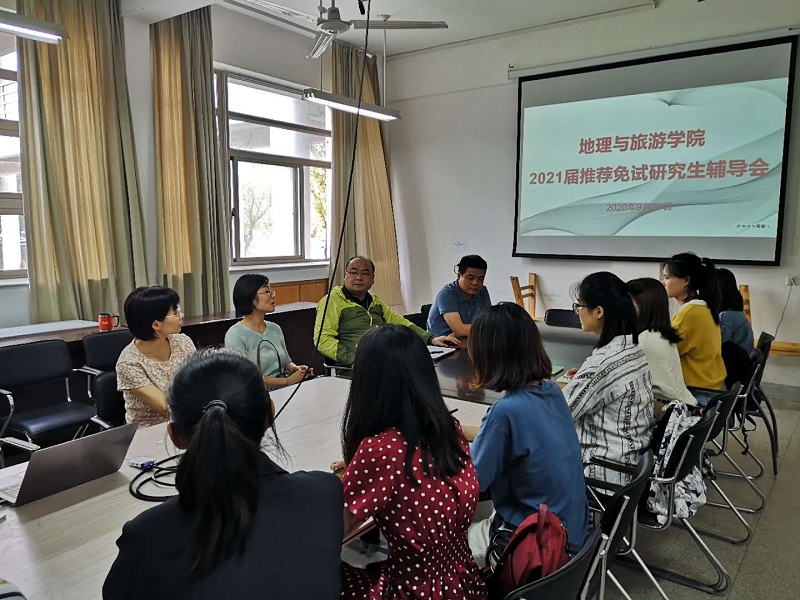 在行政楼1楼旅游教研室举行2017级旅游管理、2017级酒店管理本科生推免保研指导会,特邀学院杨钊、王群、尹寿兵、王咏老师与2017级获得推免资格的旅游、酒店本科生进行面对面交流,2017级本科生辅导员王美及10余名同学参与了指导会。