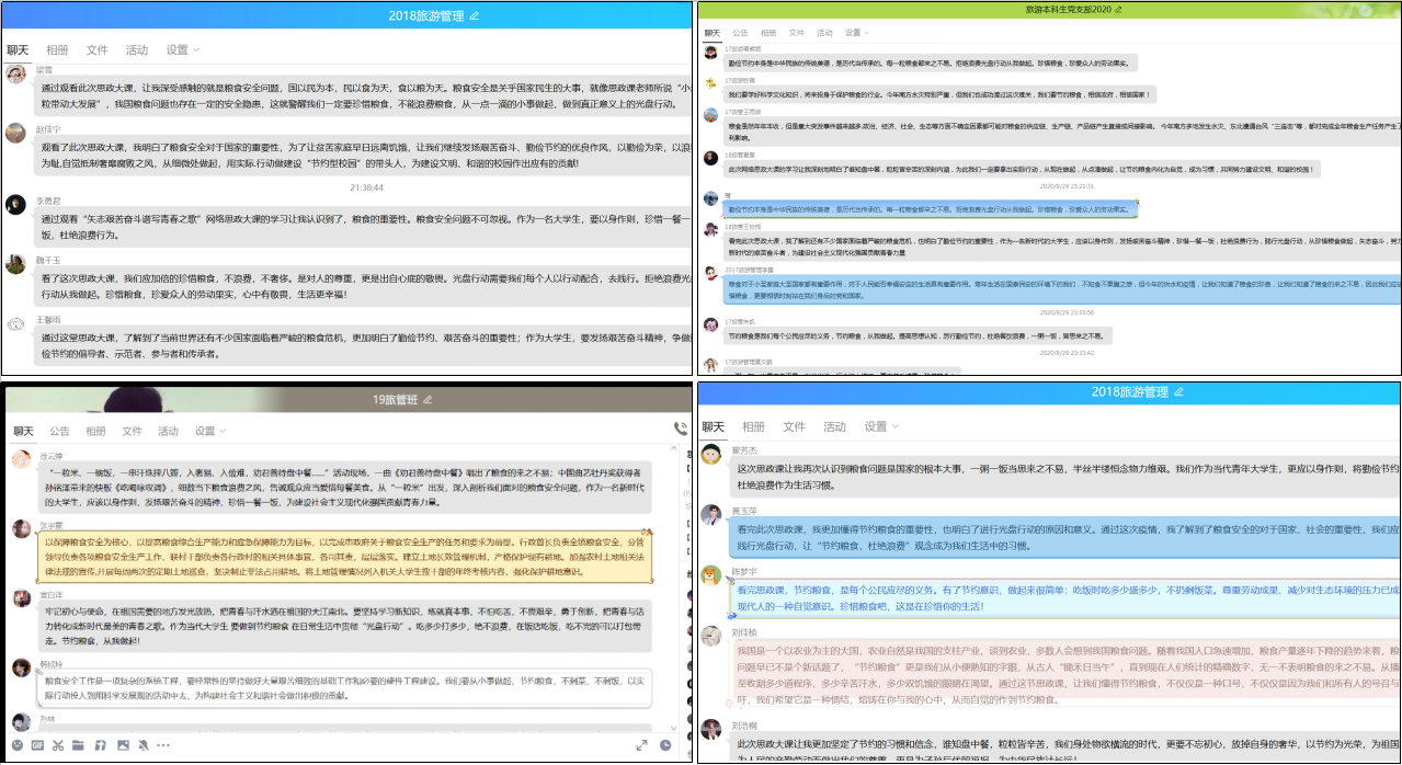 2020级旅游管理本科生 徐雨菲:今天学习了全省大学生同上一堂课主题思政大课活动。其中讲到了粮食浪费问题,我深有感触。我国是人口大国,粮食关乎到每个人的生存,我们对这个问题要重视起来,把“浪费可耻,节约为荣”的观念内化于心,外化于行。而作为一个公民,作为一名大学生,作为一名当代青年,作为一名社会主义接班人,节约粮食是我们每个人应该都要做到的事。我们要矢志艰苦奋斗,不仅是在节约浪费粮食这一件小事上做好,我们要不负青春、不负韶华、不负时代,珍惜时光好好学习,掌握知识本领,树立正确的世界观人生观,价值观,系好人生的第一粒扣子,走好人生道路。我感悟到了我们当代大学生要继续保持艰苦奋斗的精神,要脚踏实地,从小事做起,从点滴做起,在实践中谱写青春之歌。