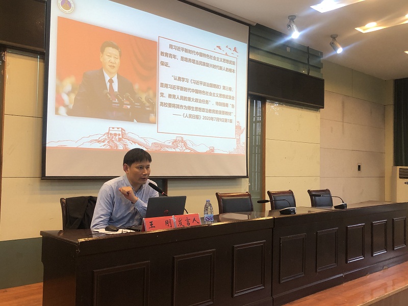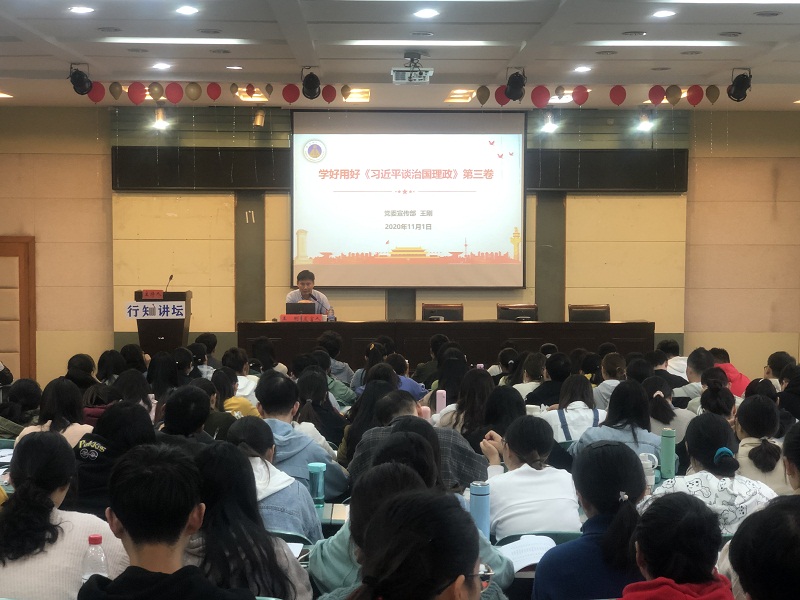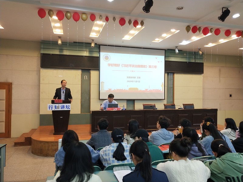 褚超群 王美)为深入学习习近平新时代中国特色社会主义思想,不断增强“四个意识”、坚定“四个自信”、做到“两个维护”,11月1日下午,地理与旅游学院邀请校党委宣传部常务副部长王刚做客“行知讲坛”,为分党校学员讲授《学好用好<习近平谈治国理政>第三卷》专题党课。地旅学院党委副书记乔静主持报告会,辅导员代表及学生党员、入党积极分子共同参加了学习。